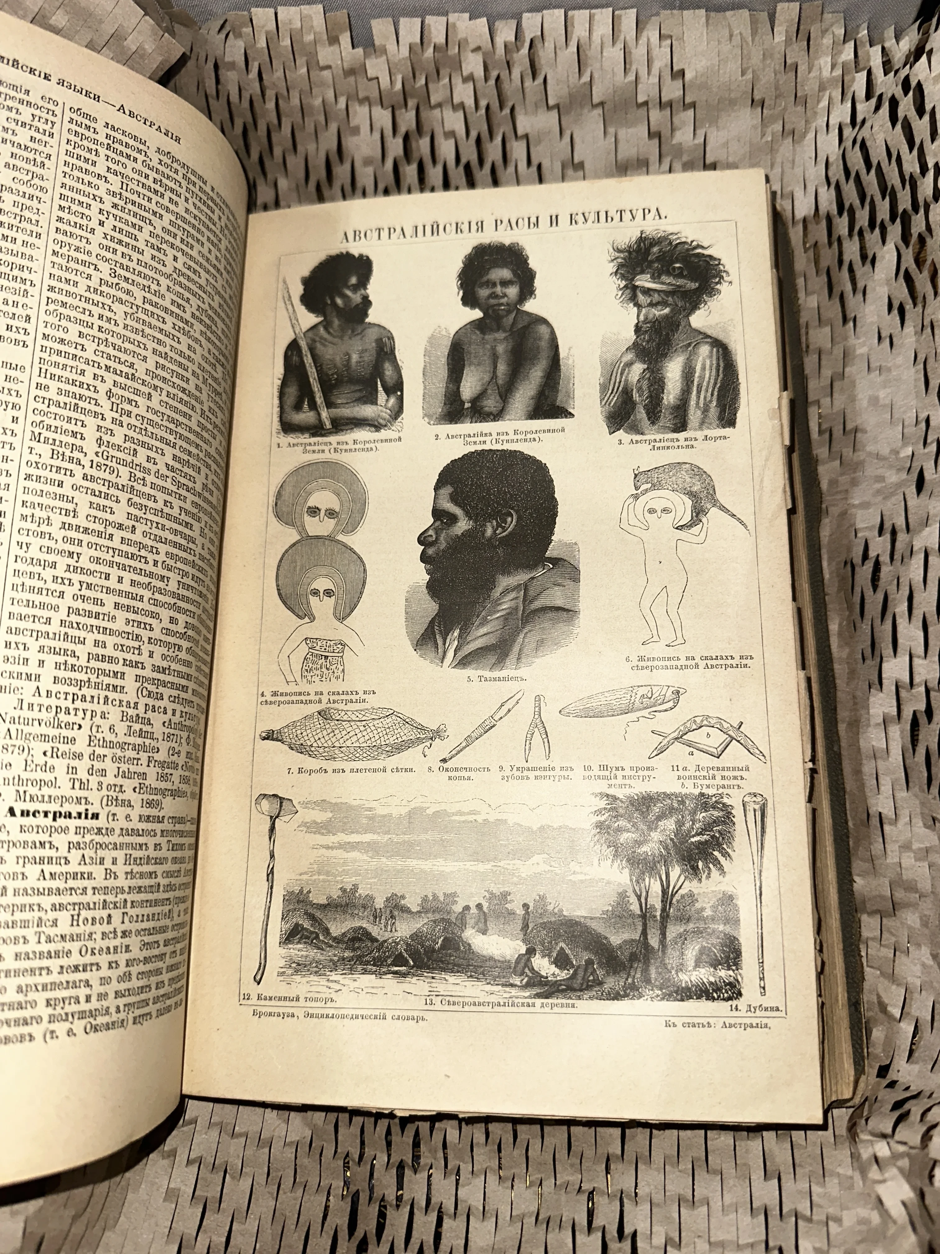 Подлинная страница из знаменитого энциклопедического словаря Брокгауза и Ефрона, представляющая собой детальный этнографический обзор Австралии конца XIX века. Гравюры мастерски передают облик коренных жителей, устройство их хижин и уникальные артефакты, включая бумеранги и каменные топоры. Состояние бумаги с естественной патиной времени подчеркивает историческую ценность и аутентичность данного экземпляра.