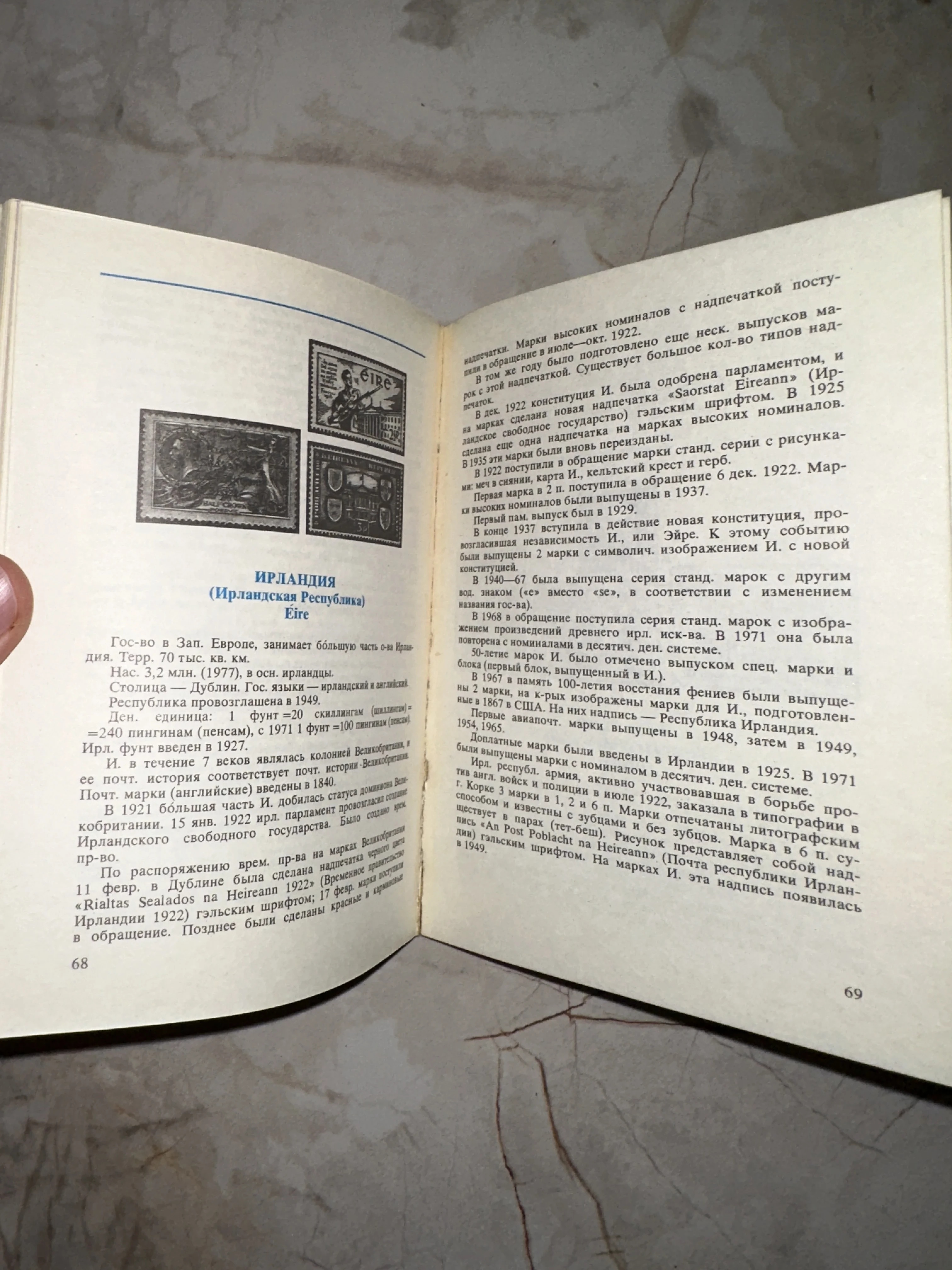 Этот книжный разворот открывает перед читателем богатую историю филателии Ирландии, начиная с 1922 года. Страницы сохранили приятный кремовый оттенок времени, а детальный текст и иллюстрации марок станут ценным источником знаний для серьезного коллекционера.