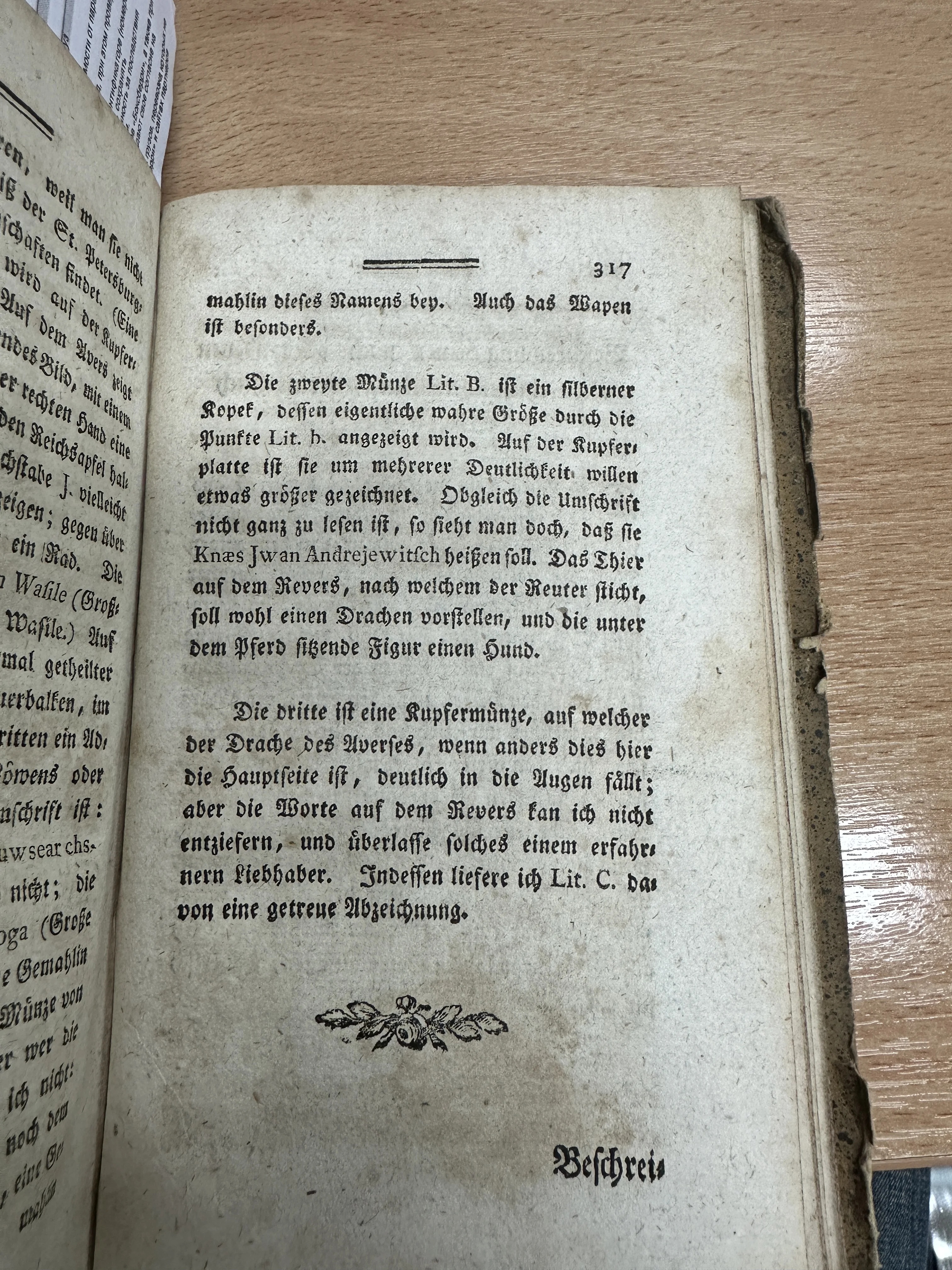 Разворот старинной книги на немецком языке с готическим шрифтом, описывающий русские монеты и серебряные копейки.