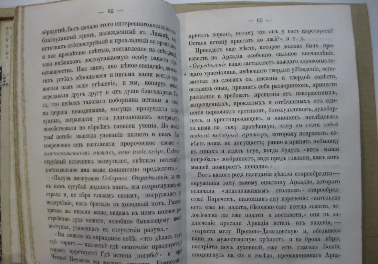 Перед вами живое свидетельство истории — разворот редкого издания, посвященного вопросам веры и старообрядчества. Пожелтевшие от времени страницы сохранили четкий типографский шрифт и атмосферу интеллектуальных дискуссий прошлых веков. Прекрасное дополнение к библиотеке коллекционера или ценный подарок для ценителя русской духовной мысли.