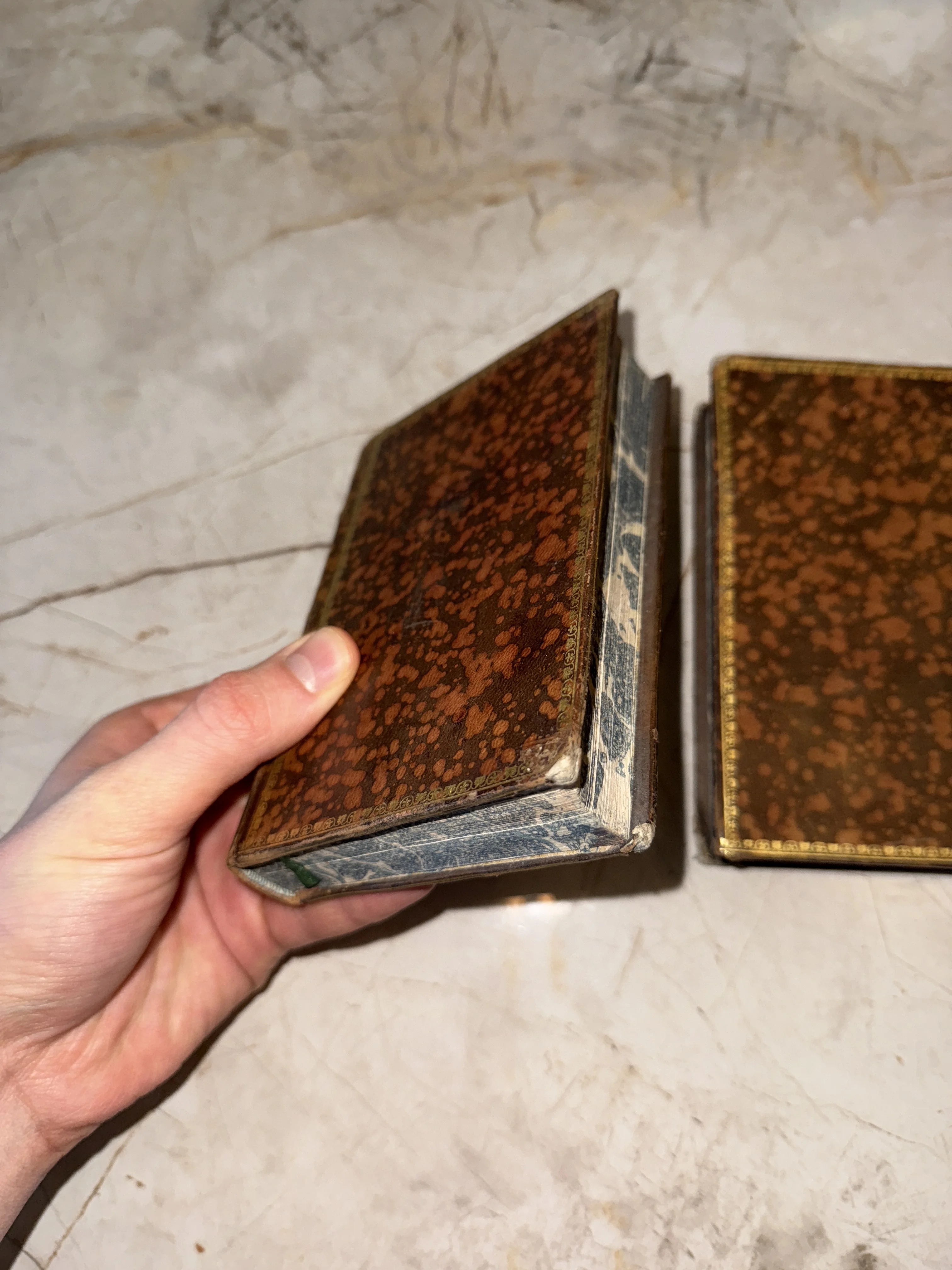 Старинная малоформатная книга в пятнистом кожаном переплете с золотым тиснением и мраморным обрезом.