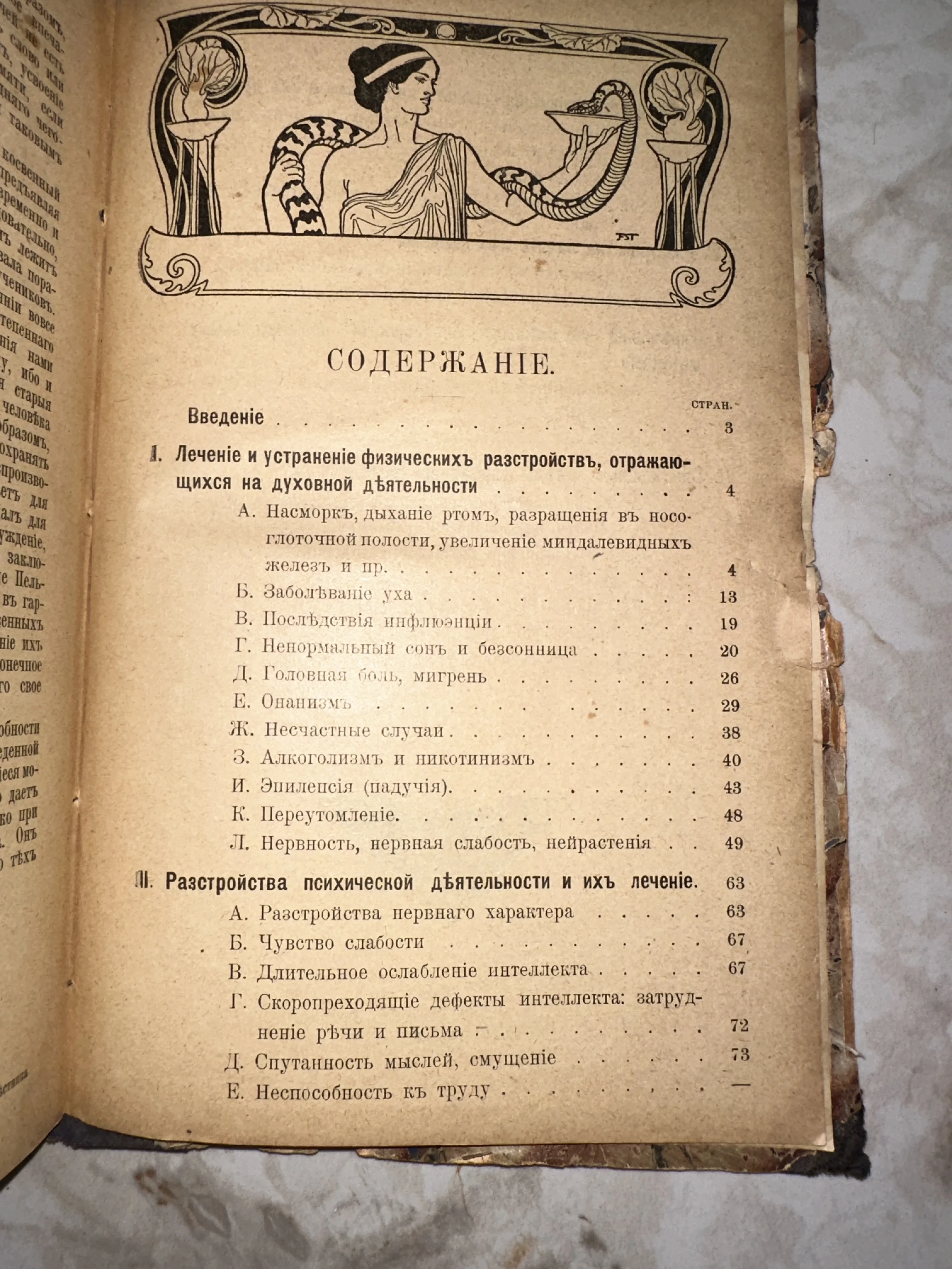Страница оглавления дореволюционной книги по медицине и психологии с аллегорической иллюстрацией богини Гигиеи.