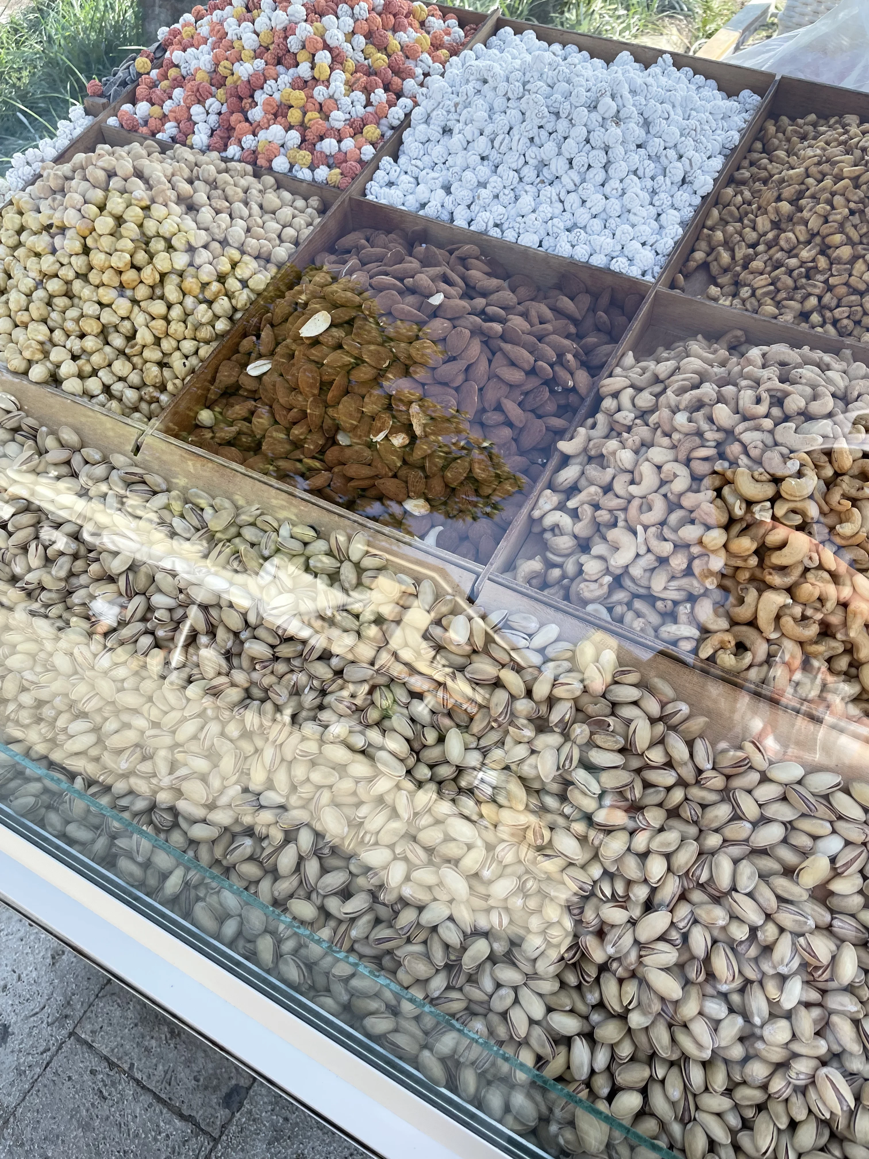 Живописная витрина передает атмосферу традиционного восточного рынка с его изобилием и разнообразием вкусов. Каждая ячейка наполнена отборными плодами — от нежно-зеленых фисташек до золотистого миндаля, создавая аппетитный геометрический узор. Это фото прекрасно иллюстрирует живую культуру современной уличной торговли и гастрономические традиции.