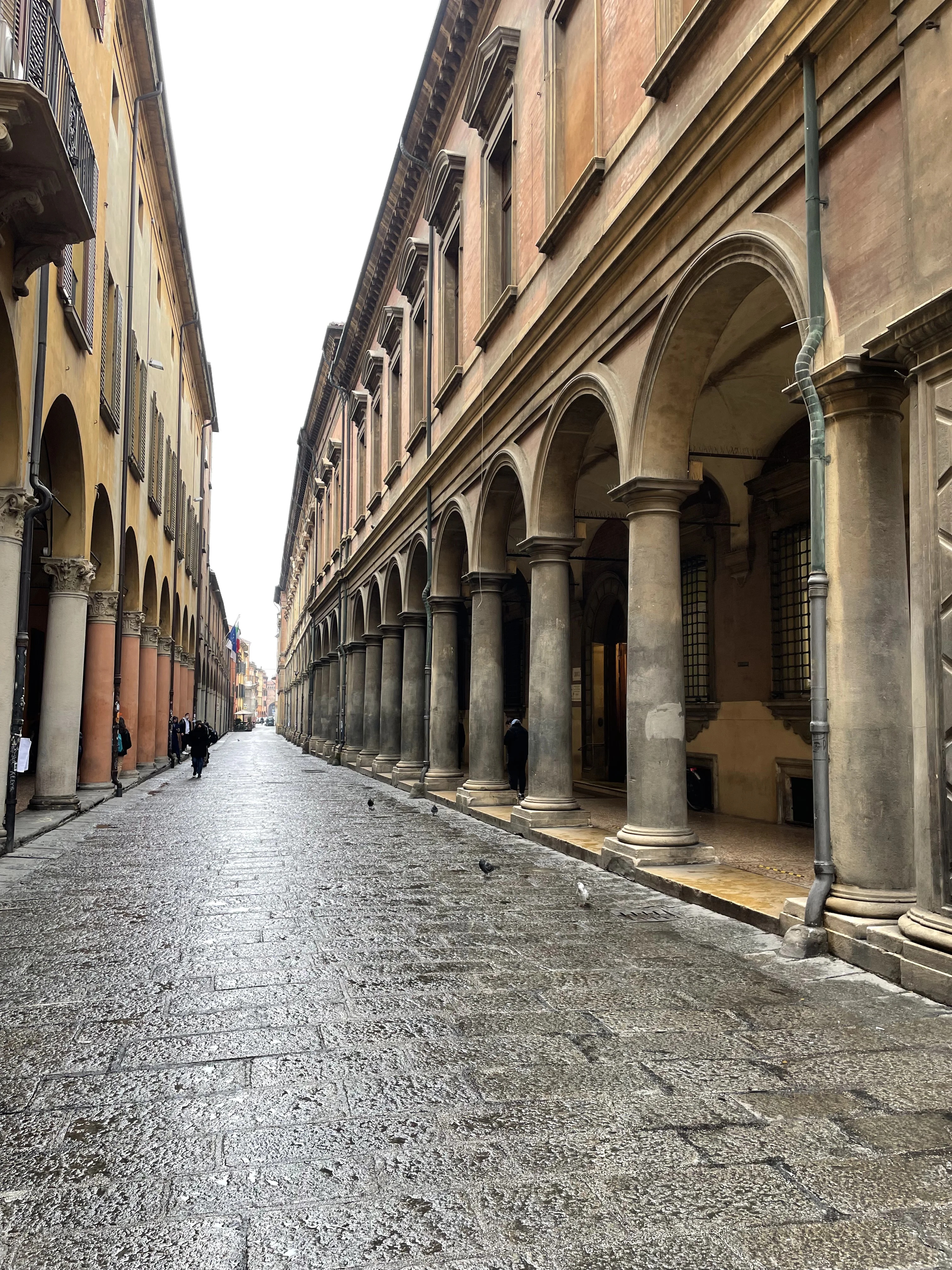 Величественная перспектива бесконечных аркад передает неповторимый дух классической архитектуры, где каждый камень дышит историей. Влажный блеск брусчатки после дождя и строгий ритм массивных колонн создают атмосферу благородного спокойствия и монументальности. Этот кадр идеально запечатлел архитектурное наследие старой Европы в его естественном величии.