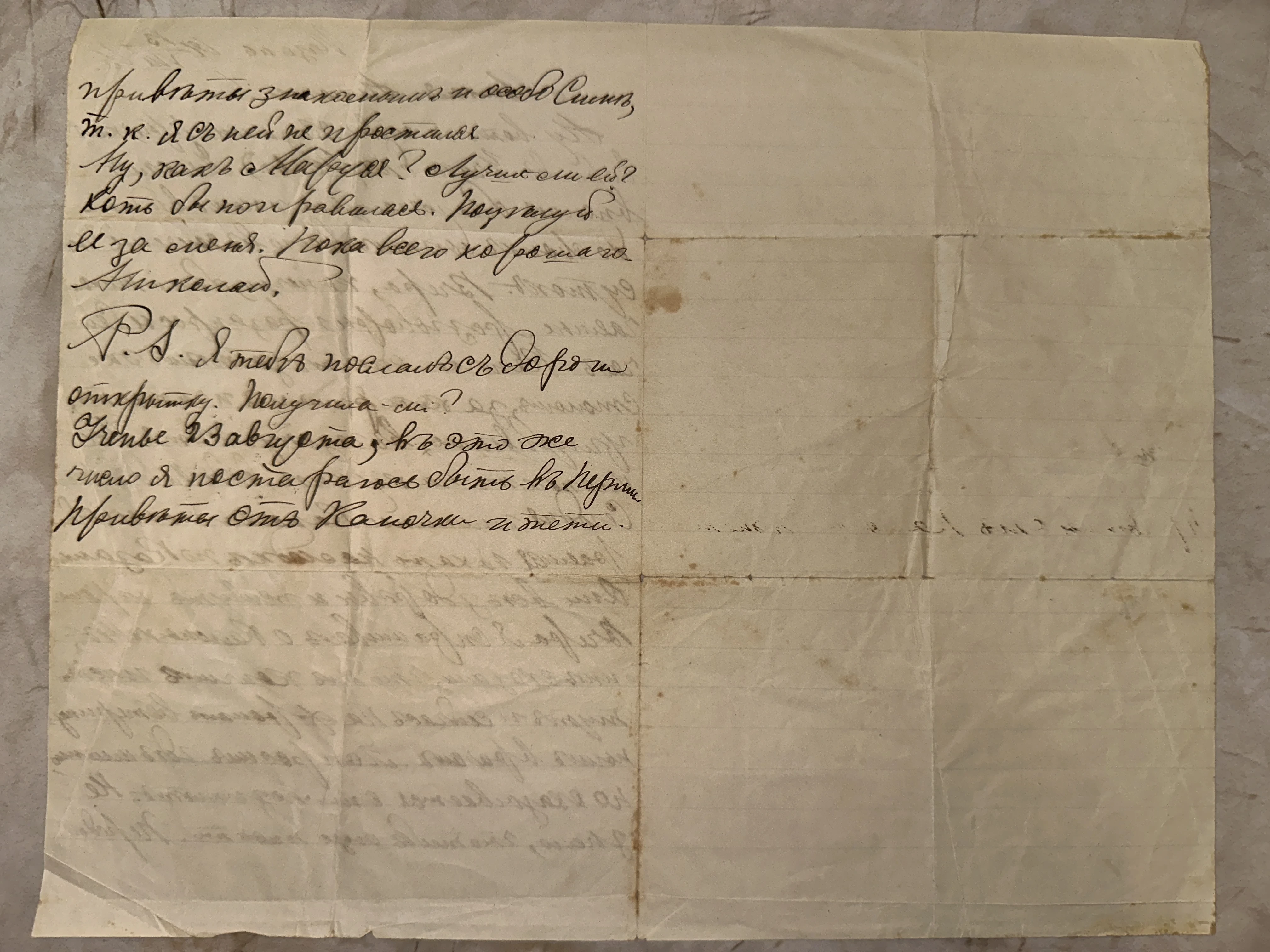 Подлинный образец частной корреспонденции с характерной дореволюционной орфографией и изящным каллиграфическим почерком. Пожелтевшая от времени бумага со следами сложения и легкой патиной хранит тепло личного послания, передавая живую атмосферу и быт ушедшей эпохи.