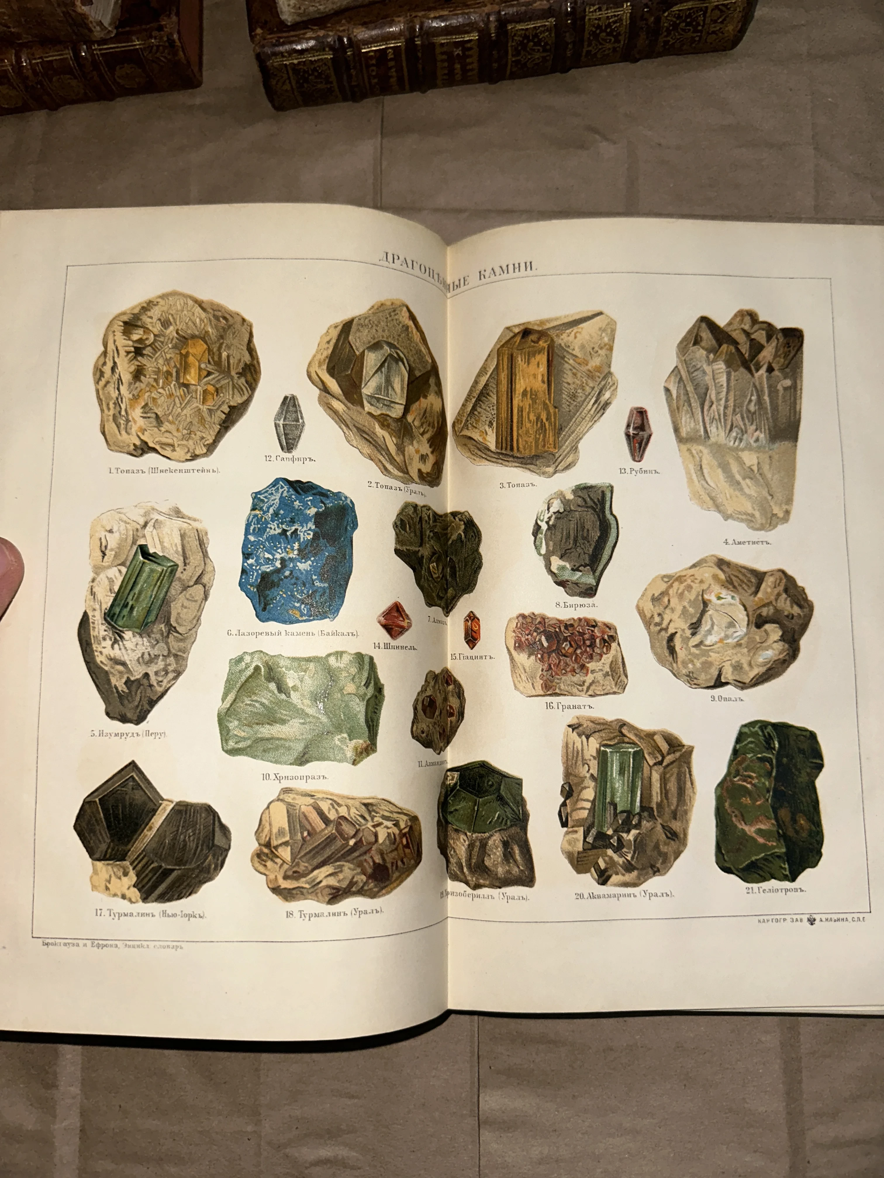 Разворот старинной книги с цветной иллюстрацией различных минералов и драгоценных камней с подписями на русском языке.