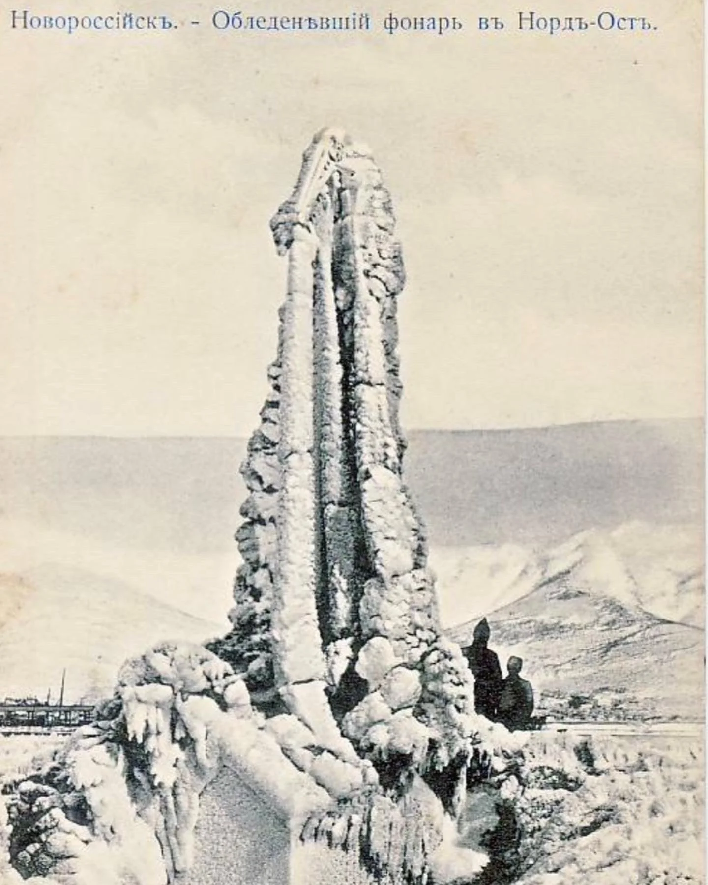 Редкий документальный снимок, запечатлевший мощь знаменитой новороссийской боры: уличный фонарь превратился в причудливое ледяное изваяние, напоминающее сказочную колонну. Масштаб стихии эффектно подчеркнут фигурами людей на фоне заснеженных гор, создавая драматичную и величественную атмосферу старого города. Фотография обладает высокой исторической ценностью для коллекционеров краеведческих материалов и любителей винтажной эстетики.
