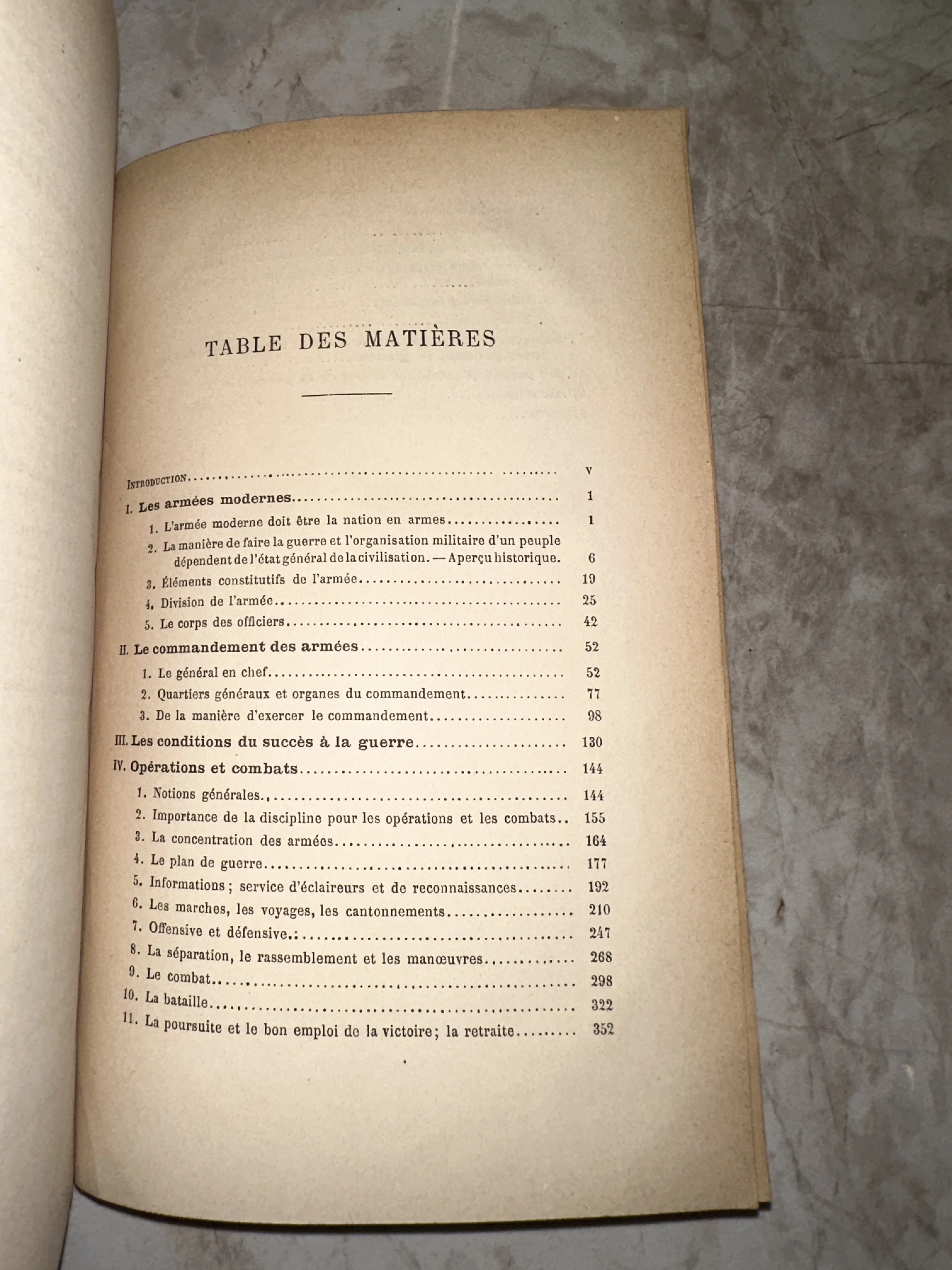Перед вами страница оглавления редкого французского издания, посвященного искусству войны и структуре современных армий. Пожелтевшая от времени бумага и классическая типографика рубежа веков создают неповторимую атмосферу серьезного исторического исследования. Книга сохранила отличную читаемость текста и станет ценным дополнением к библиотеке коллекционера военной литературы.