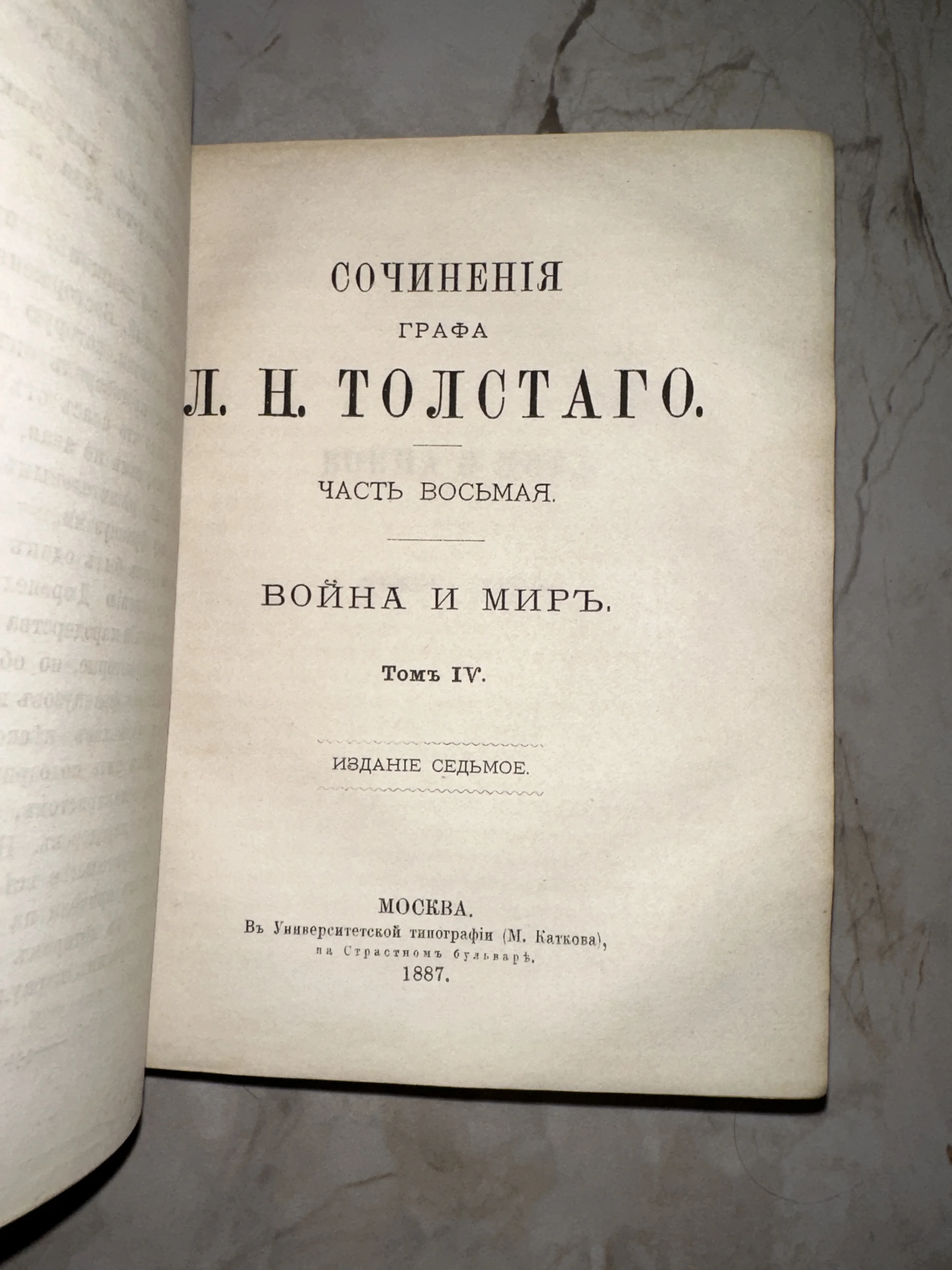 Титульный лист антикварной книги графа Л. Н. Толстого «Война и мир», том 4, изданный в Москве в 1887 году.
