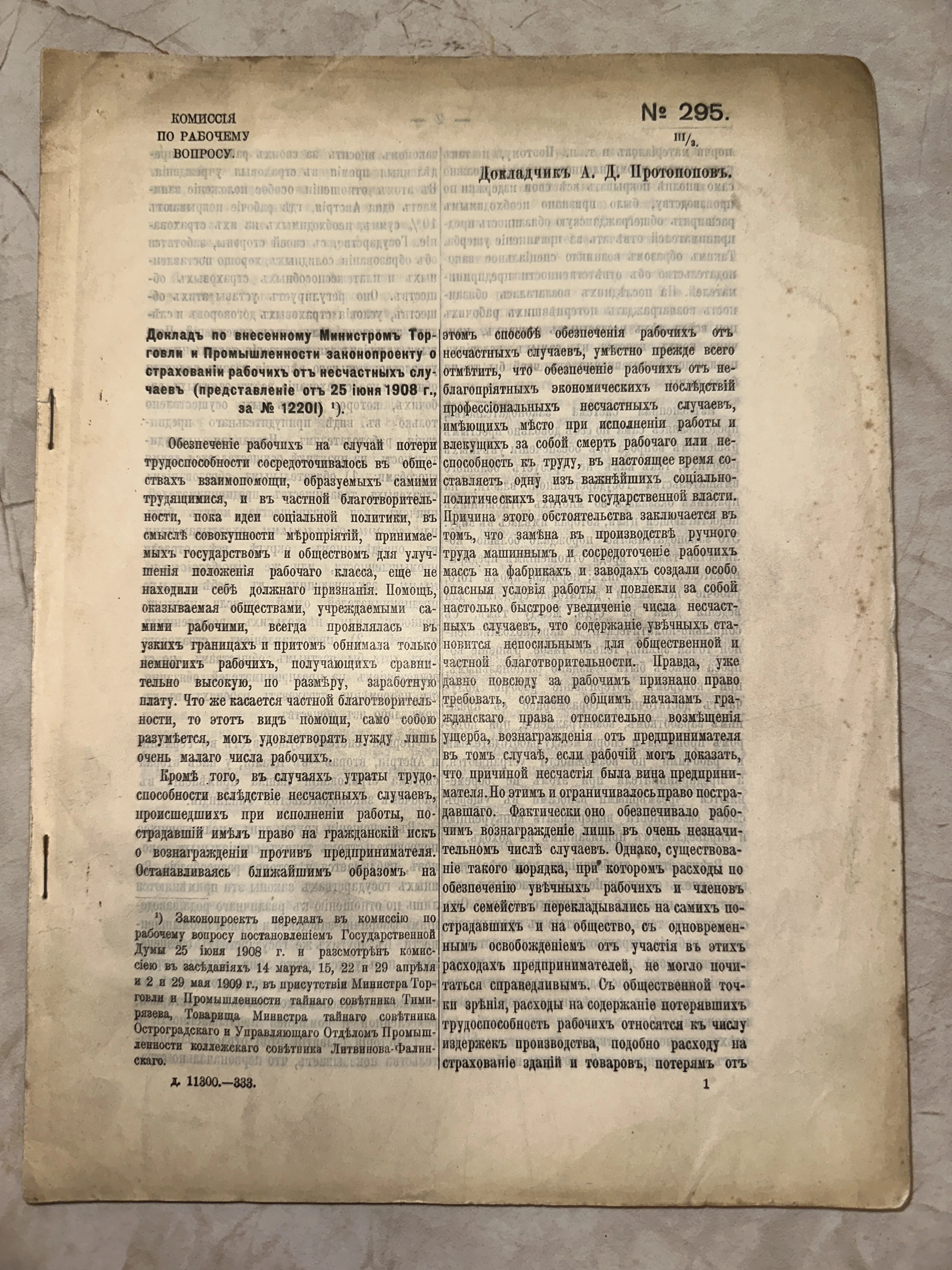 Уникальный образец дореволюционной деловой печати, посвященный важнейшему социальному вопросу Российской империи — защите прав трудящихся. Текст на плотной бумаге с характерной патиной времени и дореформенной орфографией передает строгую атмосферу государственных комиссий начала прошлого века. Идеальный экспонат для частного архива или коллекции документов по истории права и промышленности.
