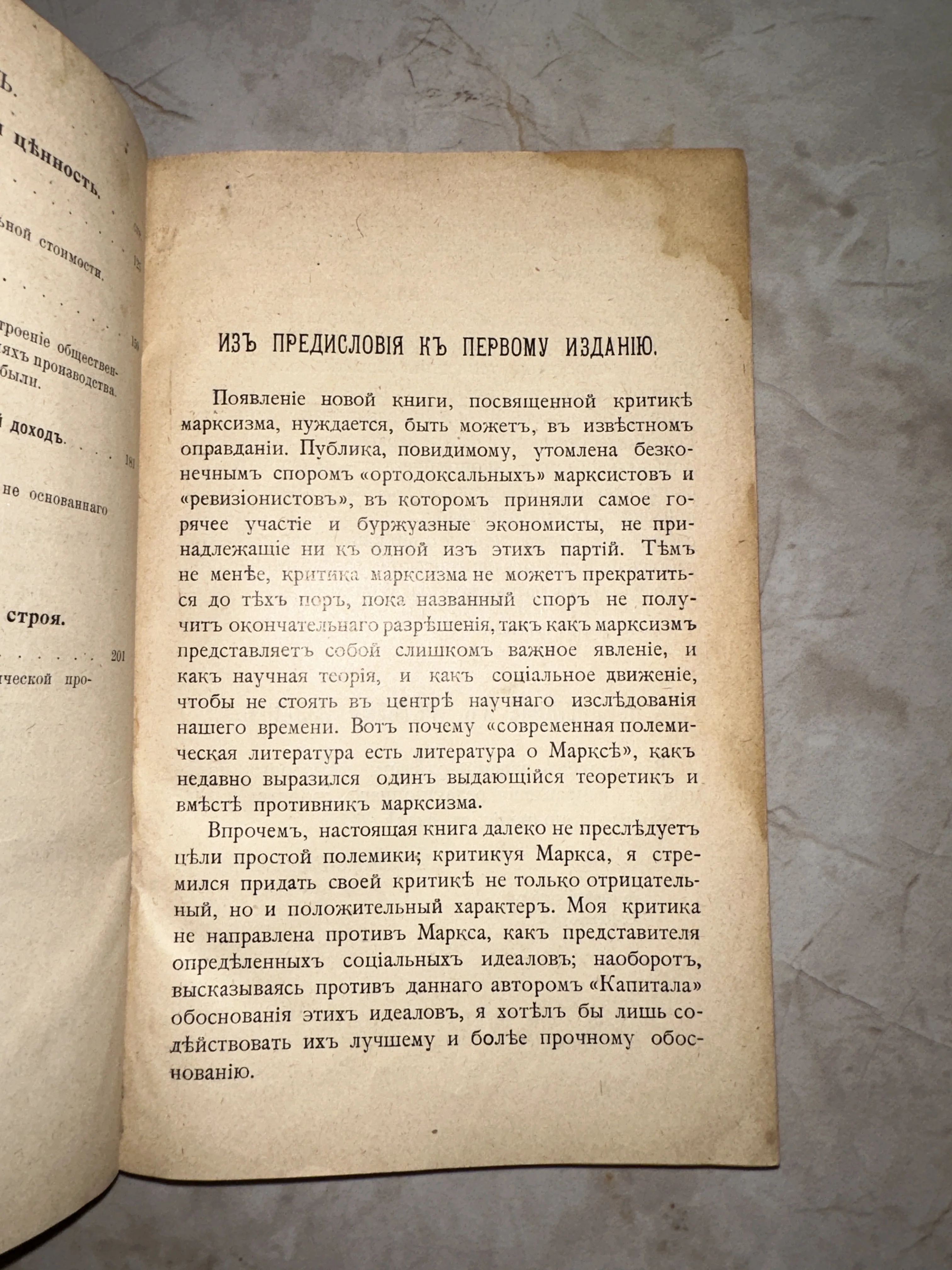 Перед вами подлинный фрагмент интеллектуальной истории — страница из философско-экономического труда начала XX века с размышлениями о марксизме. Пожелтевшая от времени бумага и характерный типографский шрифт дореволюционной России создают неповторимую атмосферу научного поиска ушедшей эпохи.