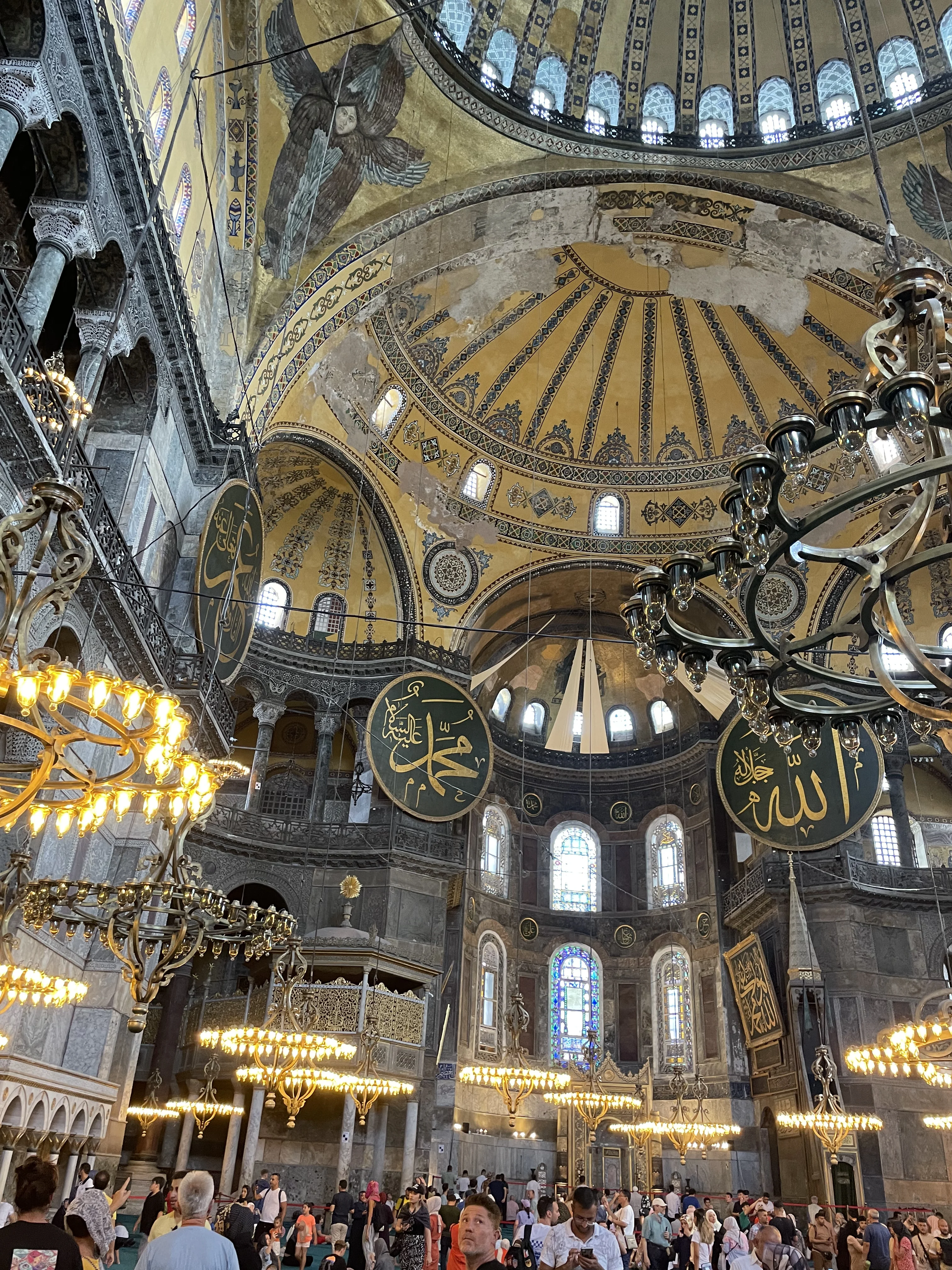 Внутреннее пространство собора поражает уникальным синтезом византийского зодчества и исламского декоративного искусства. Золотистый свет, льющийся из-под купола, оживляет древние мозаики и подчеркивает монументальность каллиграфических панно. Это величественное сооружение хранит в себе следы великих империй и является жемчужиной мирового архитектурного наследия.