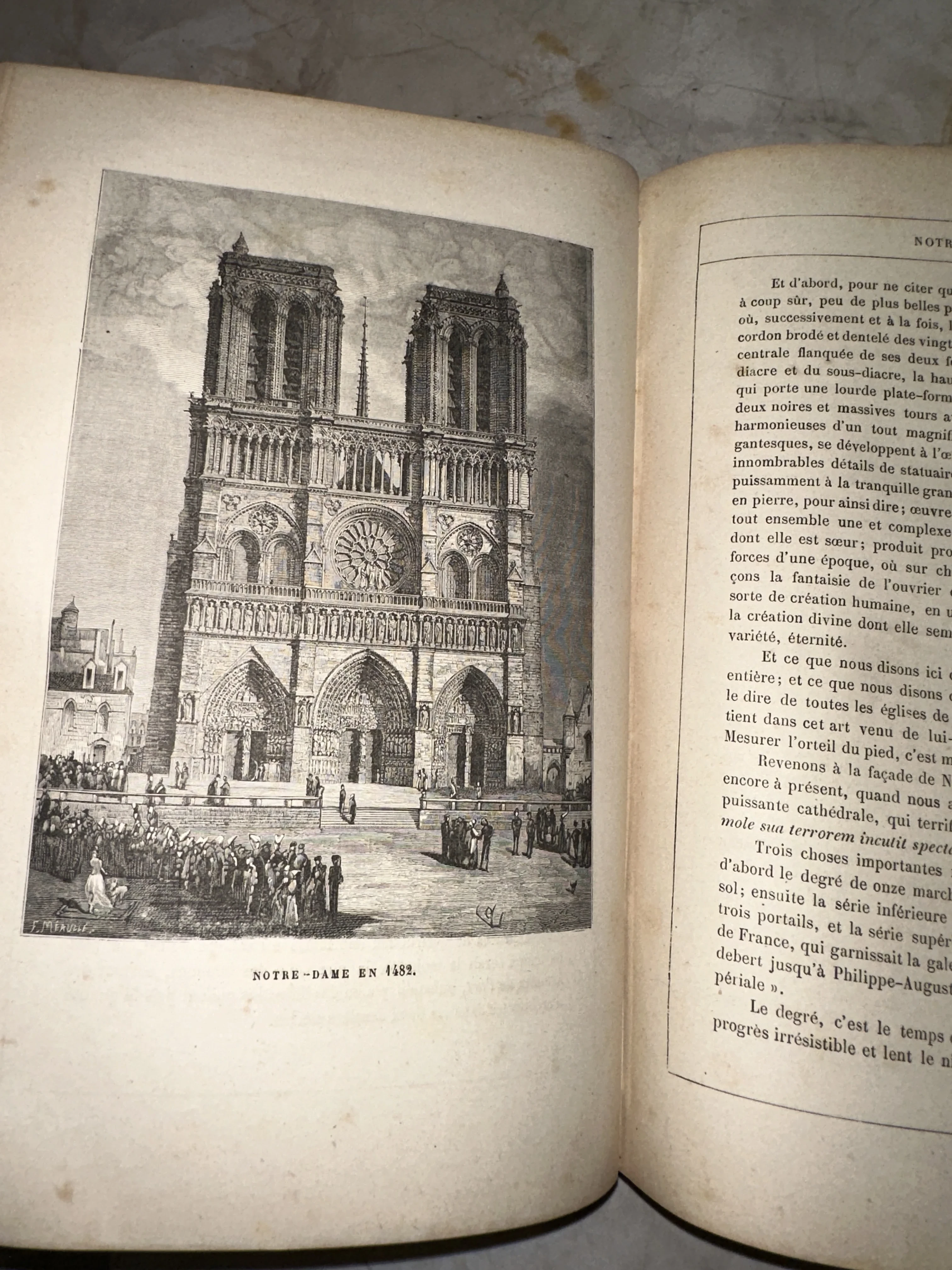 Разворот антикварной книги с детальной черно-белой гравюрой фасада собора Нотр-Дам де Пари и текстом на французском языке.