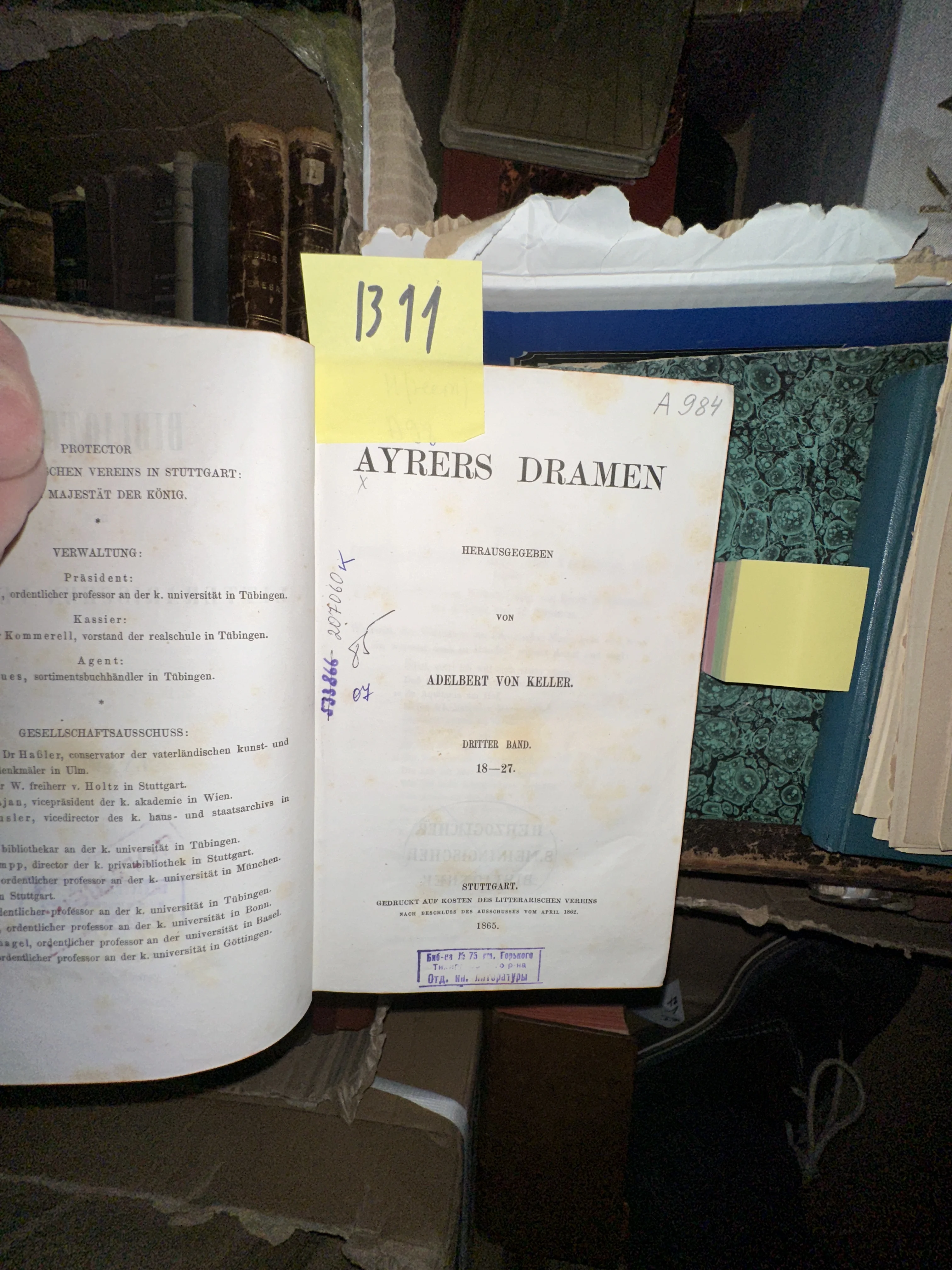 Редкий образец немецкой драматургии XIX века — третий том собрания сочинений Якоба Айрера, изданный Литературным обществом Штутгарта. На страницах сохранились аутентичные архивные пометки и штамп иностранного отдела библиотеки, что свидетельствует о богатой истории этого экземпляра. Характерное для эпохи состояние бумаги и типографское оформление делают книгу ценным приобретением для ценителей европейской букинистики.