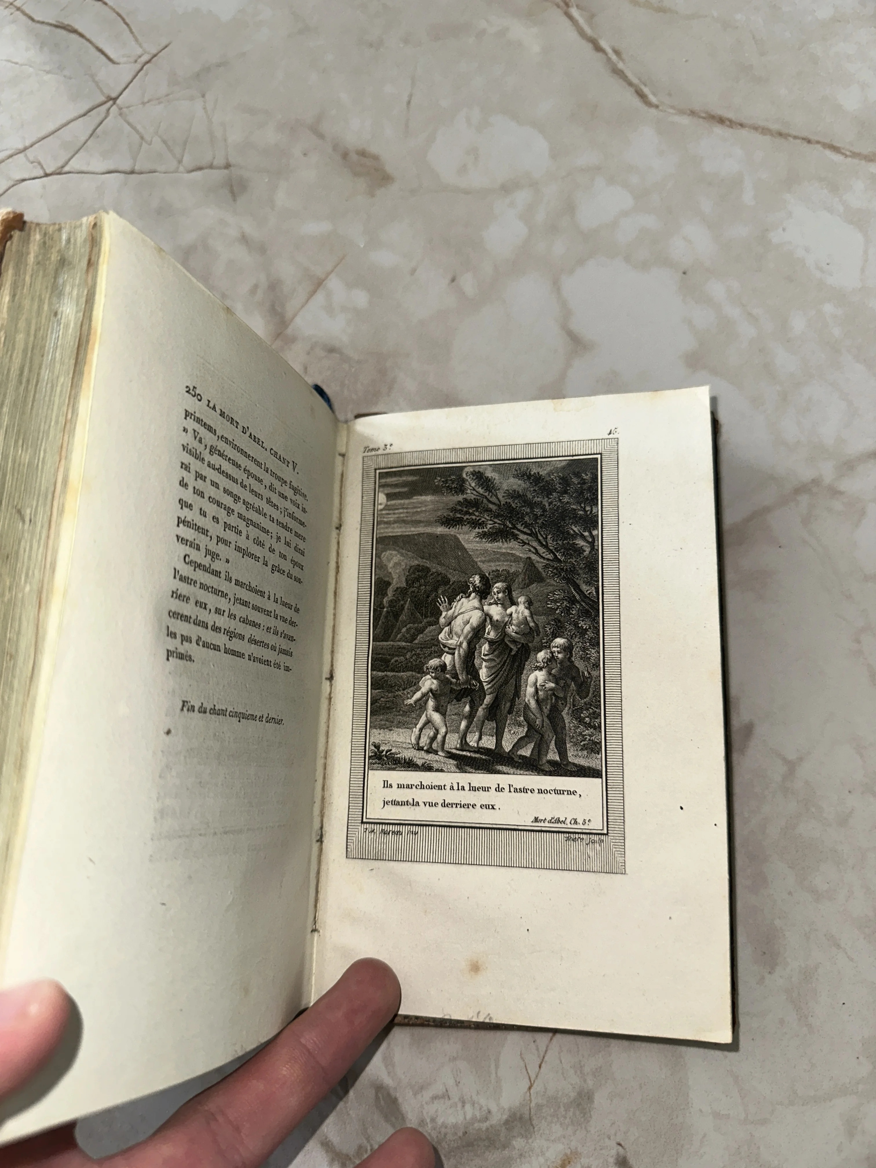 Изящный образец книгопечатания XVIII-XIX веков — поэма Соломона Гесснера «Смерть Авеля» на французском языке. Глубокий оттиск гравюры и сохранившаяся текстура бумаги передают подлинную атмосферу эпохи просвещения. Коллекционное состояние с благородными следами времени делает этот экземпляр ценным приобретением для домашней библиотеки.