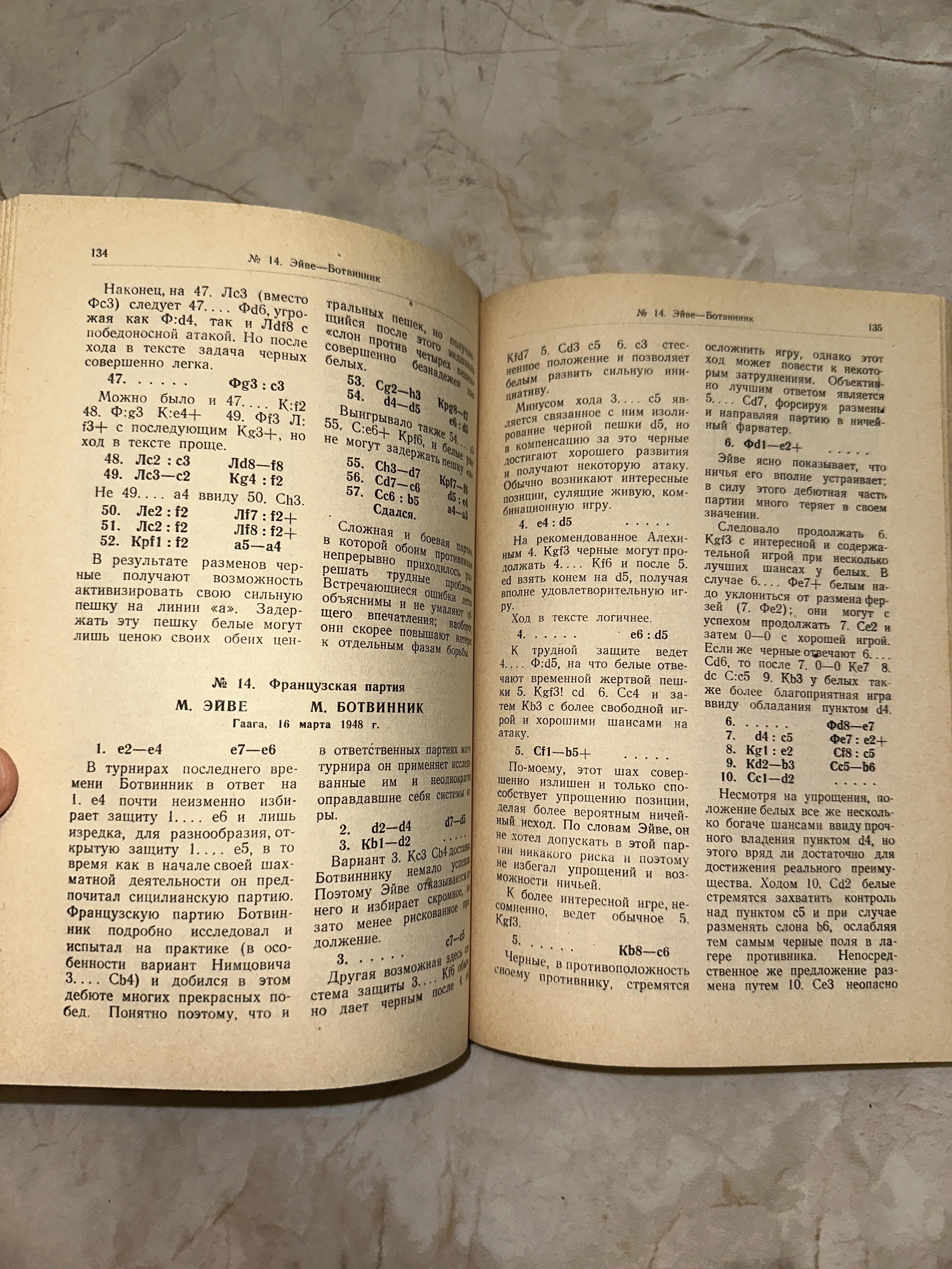 Разворот старой шахматной книги с описанием и нотацией партии между Максом Эйве и Михаилом Ботвинником 1948 года.