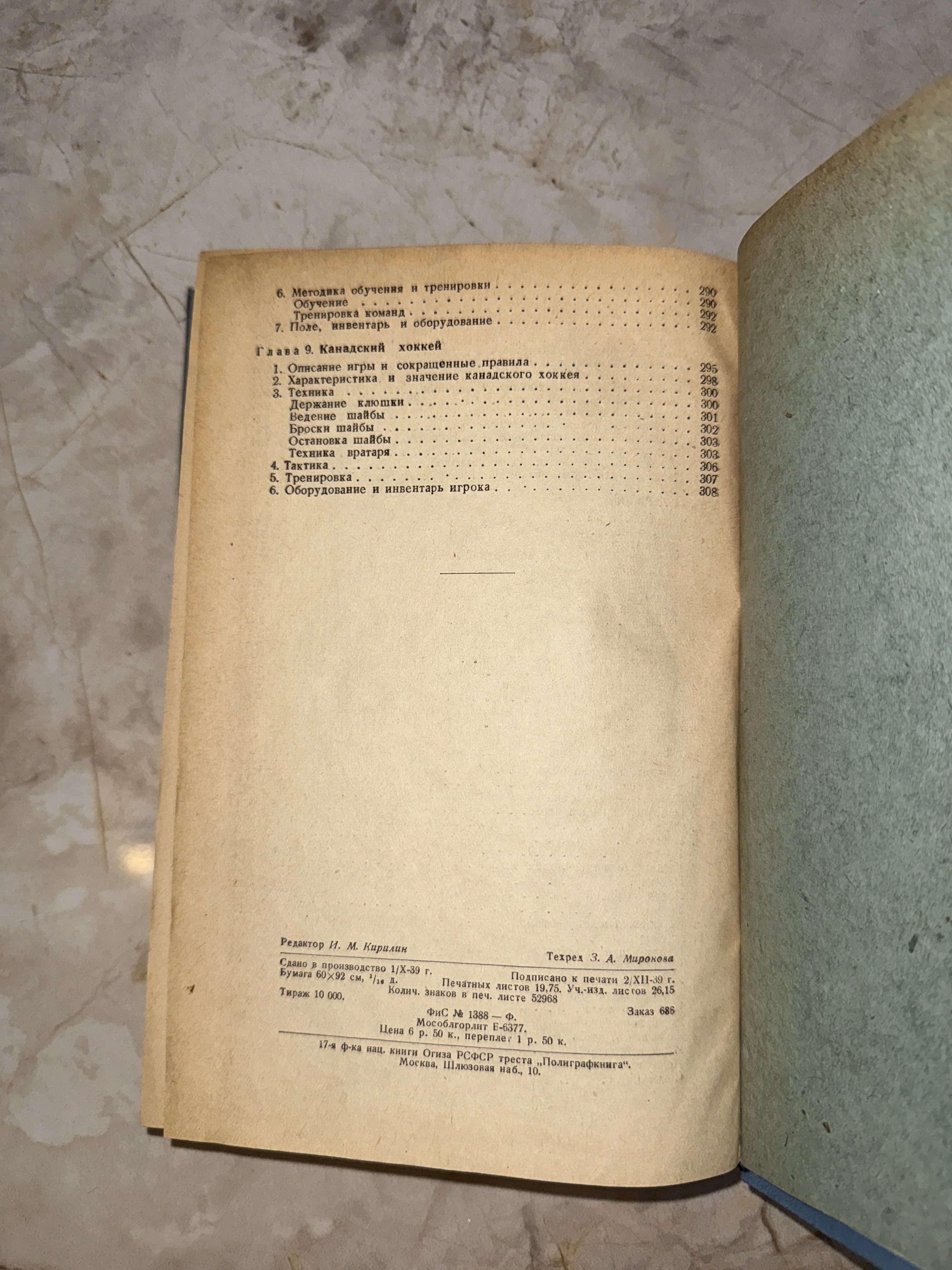 Фотография страницы старой книги 1939 года с оглавлением главы про канадский хоккей и техническими данными печати.