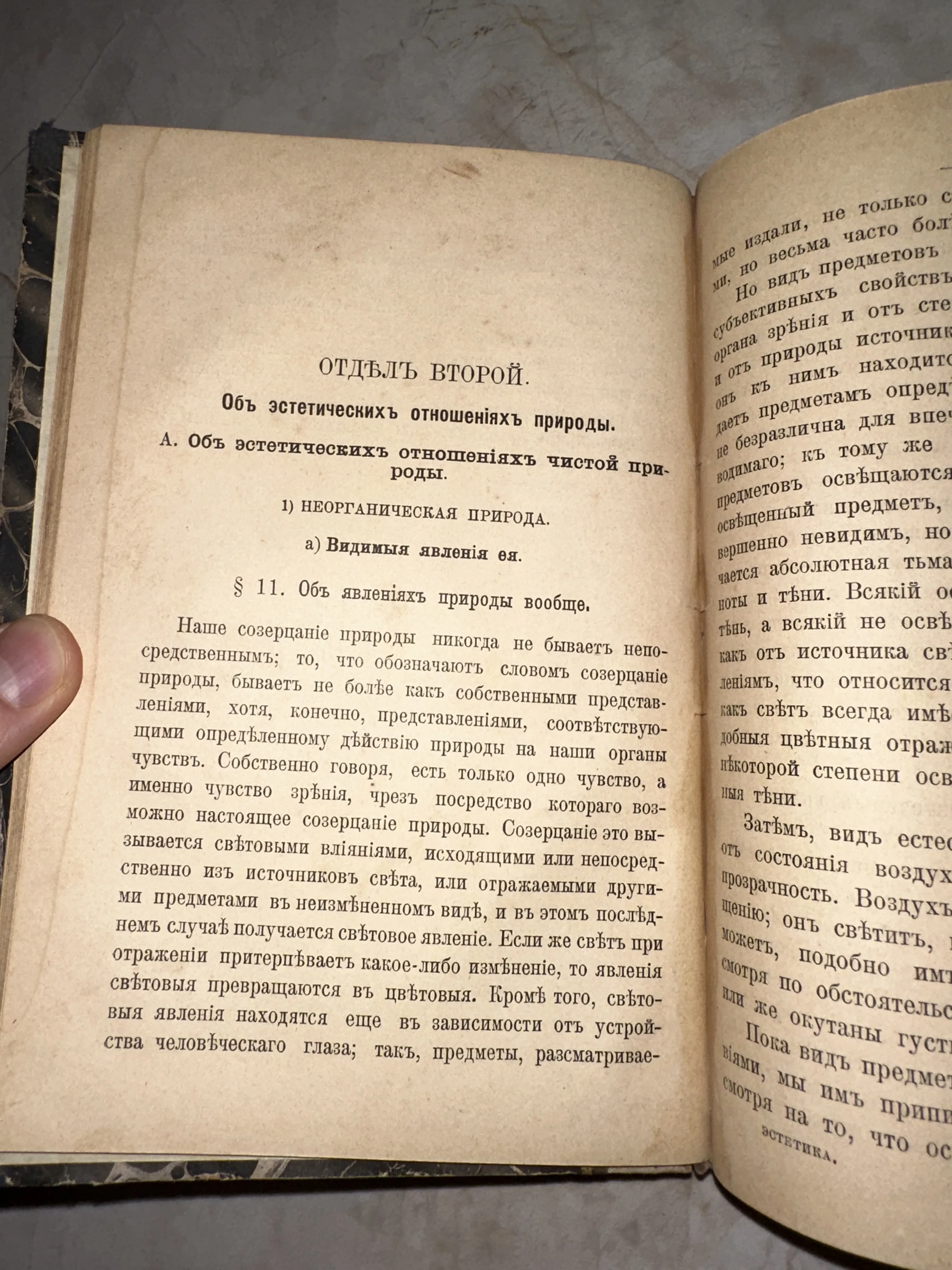 Этот редкий экземпляр дореволюционной печати приглашает читателя погрузиться в глубокие философские размышления о красоте окружающего мира. Пожелтевшие страницы с четким типографским шрифтом и характерной орфографией сохранили неповторимую атмосферу интеллектуального поиска XIX века. Издание представляет коллекционный интерес для любителей классической эстетики и редких библиографических находок.