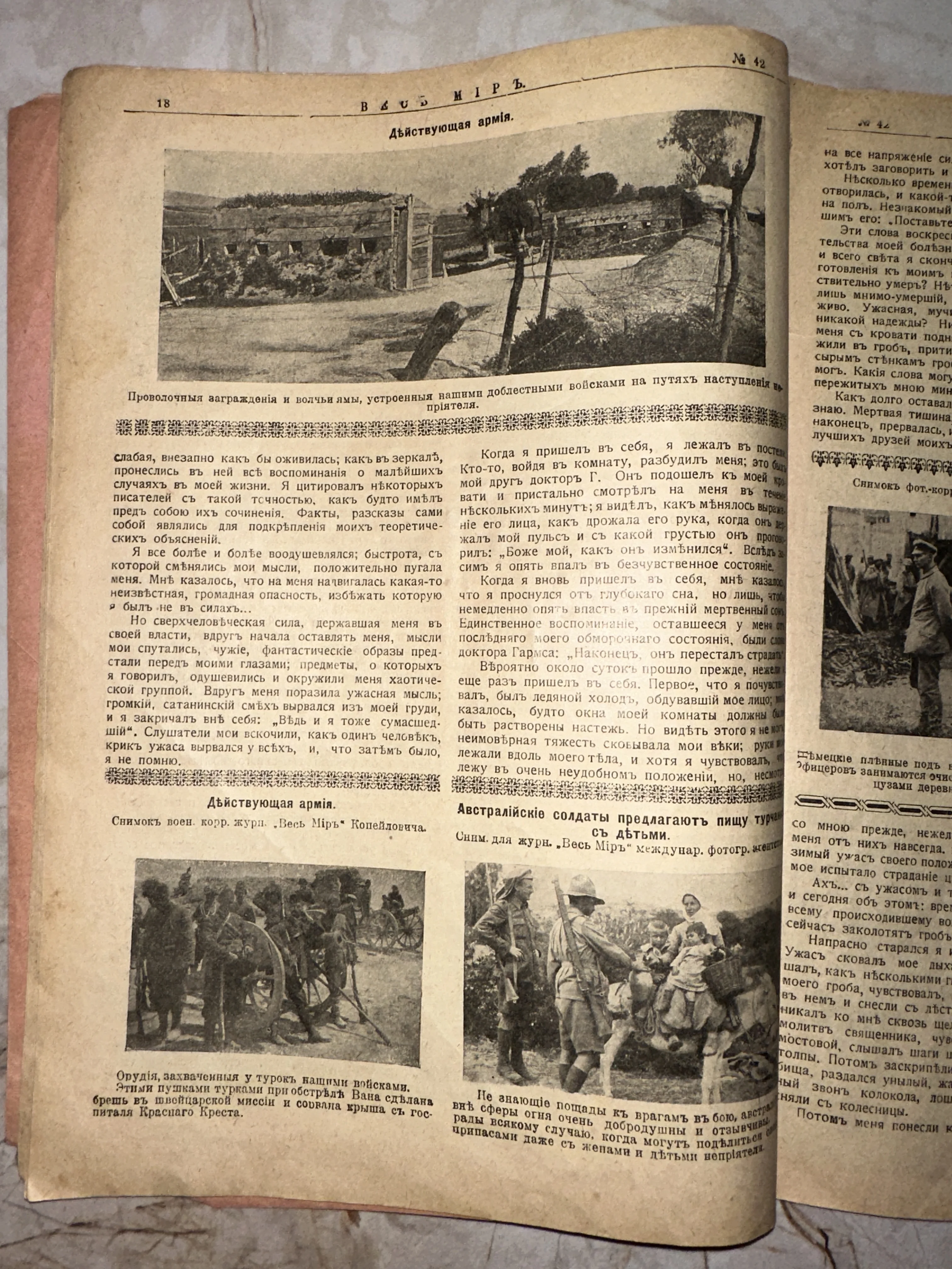 Старинная страница иллюстрированного журнала с черно-белыми фотографиями военных заграждений, трофейных орудий и солдат Первой мировой войны.
