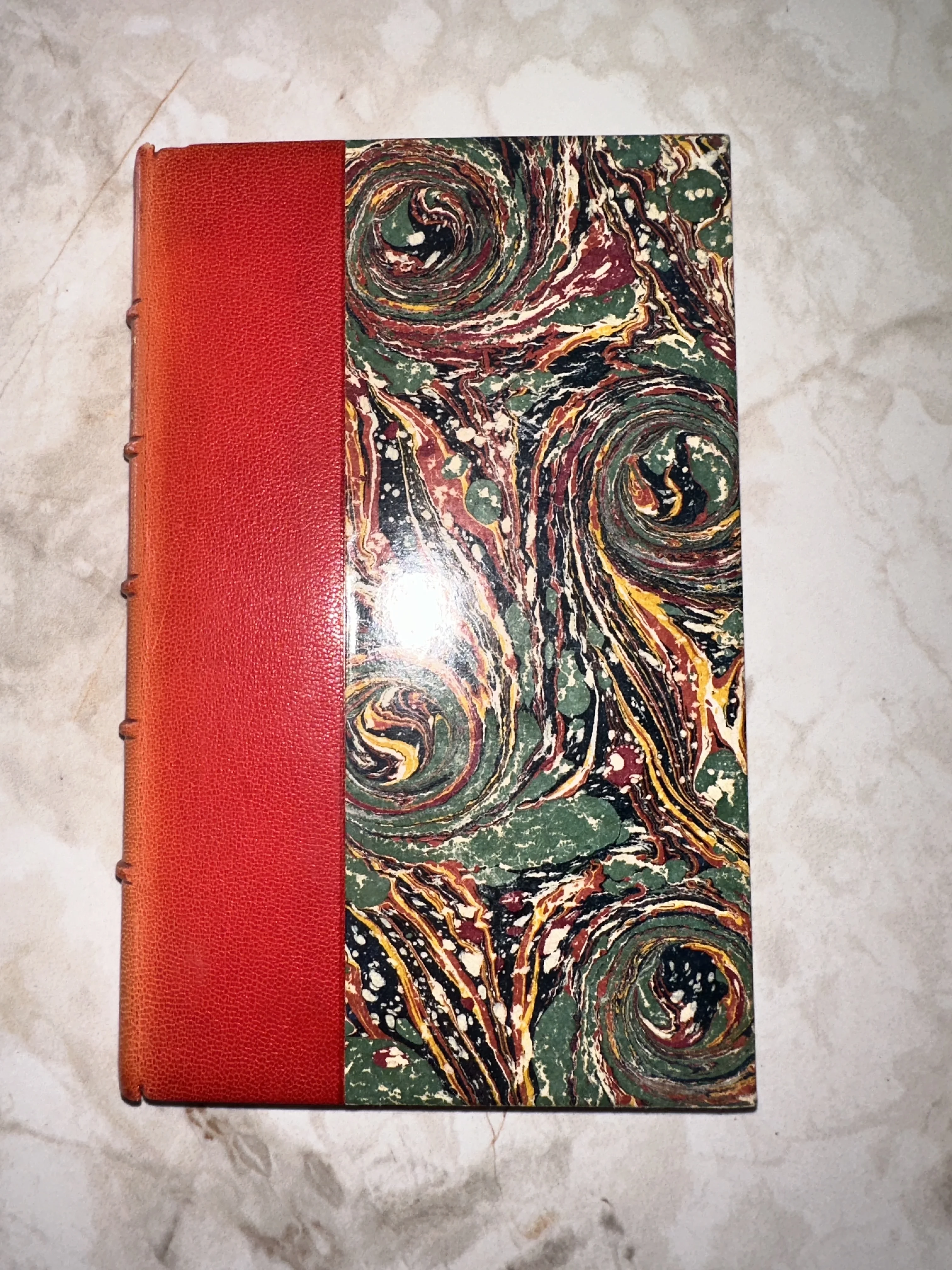 Великолепный образец переплетного мастерства с использованием ручной мраморной бумаги, создающей уникальный гипнотический узор. Насыщенный красный корешок с аккуратными бинтами придает изданию благородный вид и подчеркивает его коллекционную ценность. Книга находится в отличной сохранности, представляя собой эстетичный артефакт ушедшей эпохи.