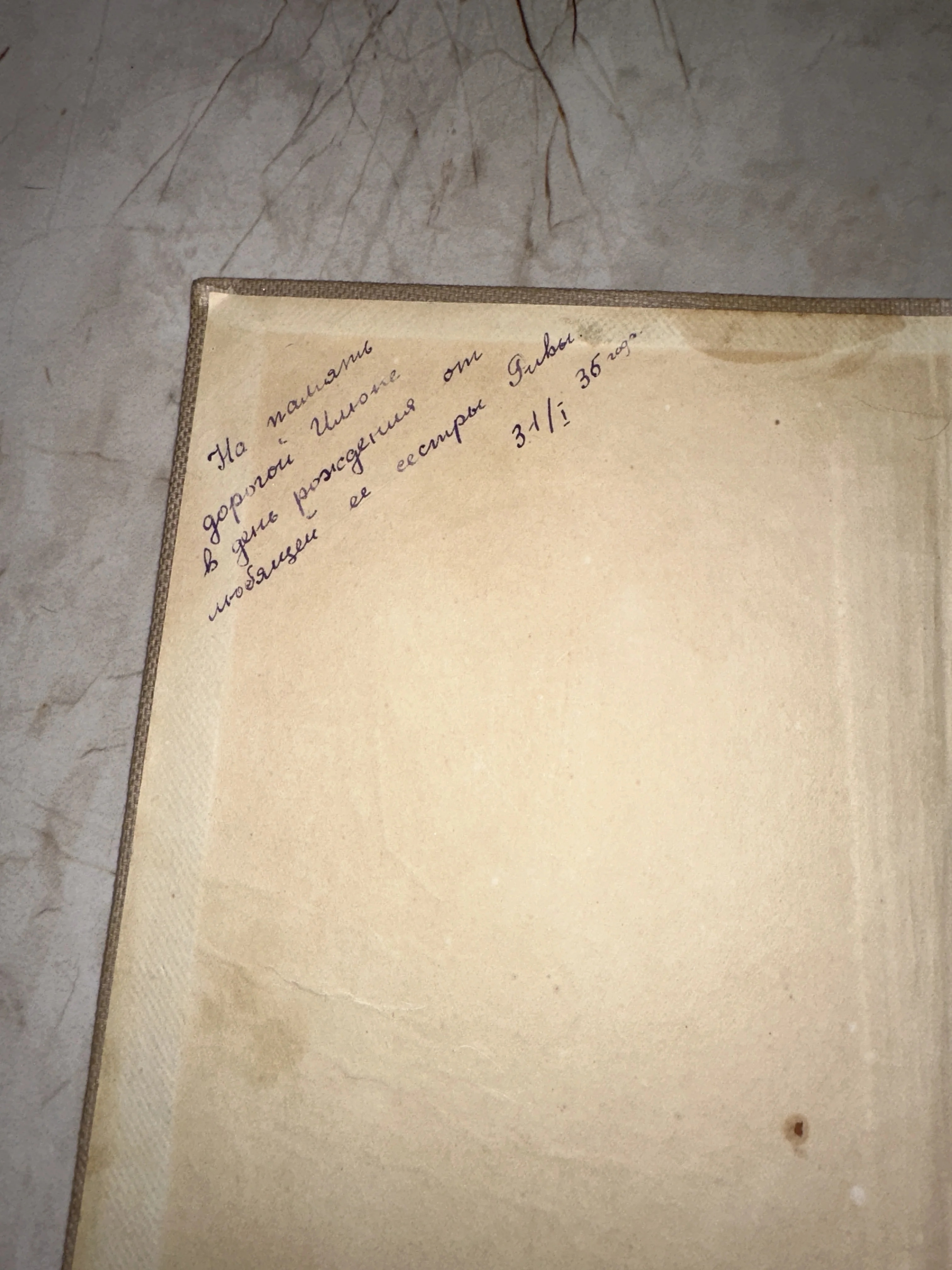 Трогательный артефакт эпохи: аккуратный каллиграфический почерк на пожелтевшем форзаце хранит память о семейной привязанности довоенного времени. Естественная патина бумаги и четкие чернильные линии подчеркивают подлинность и уникальную историю этого коллекционного экземпляра.