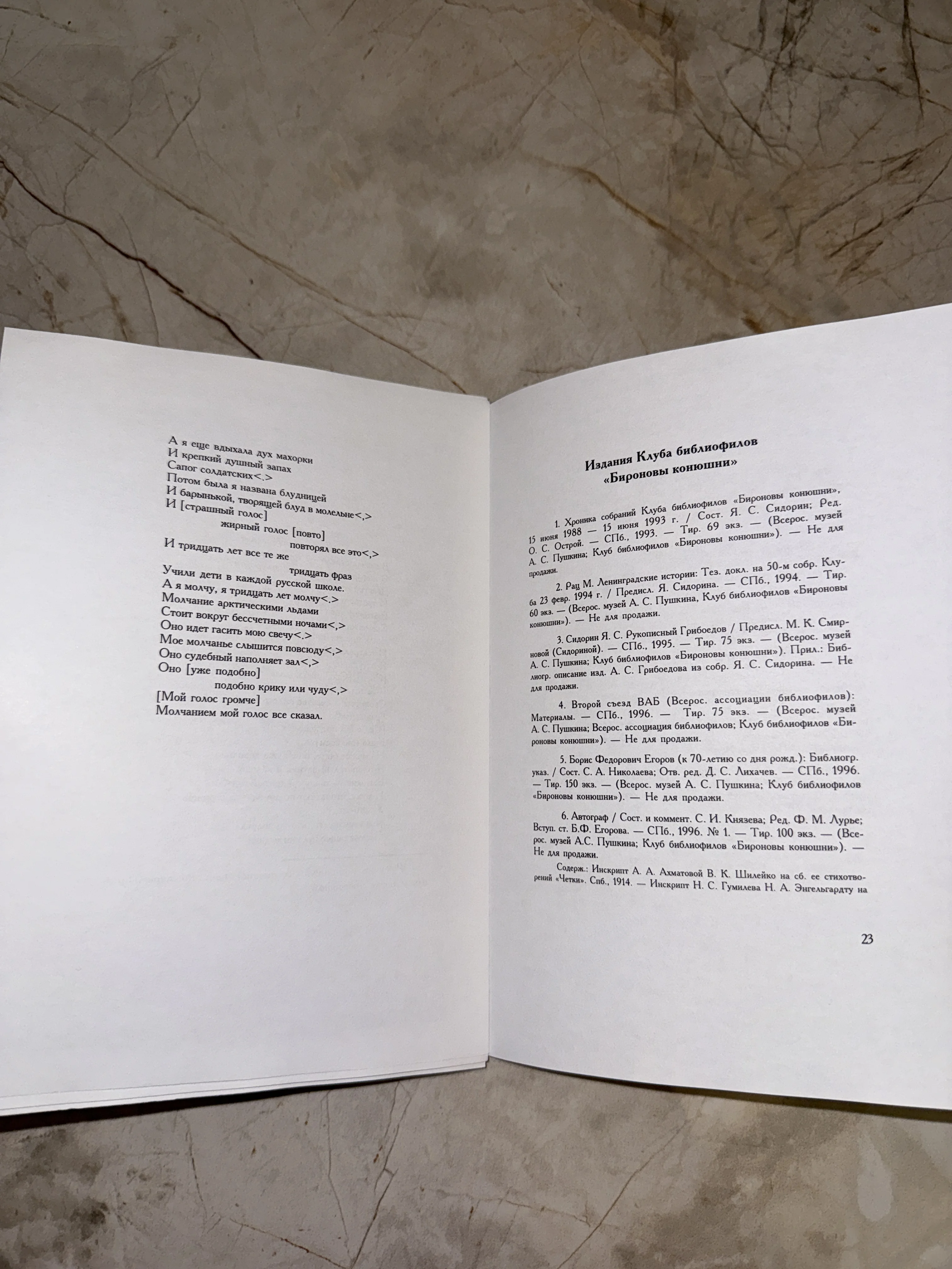 Перед вами разворот из малотиражного издания, посвященного истории петербургского библиофильства и наследию Анны Ахматовой. Страницы содержат уникальный перечень редких выпусков клуба «Бироновы конюшни», изданных ограниченным тиражом в 1990-х годах. Превосходная сохранность бумаги и четкая типографика делают этот экземпляр ценным приобретением для коллекционеров редких книг и исследователей литературы.