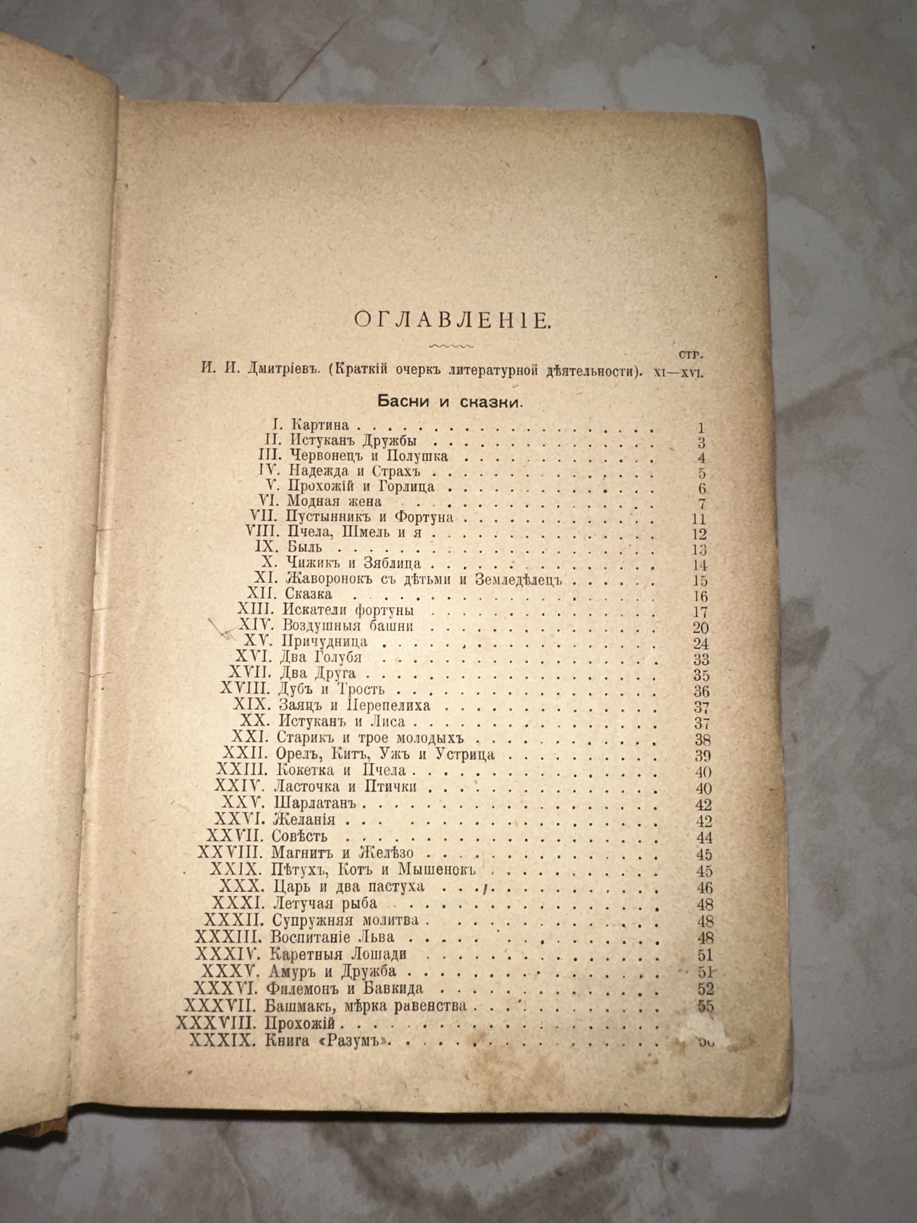 Старинное оглавление книги басен И. И. Дмитриева