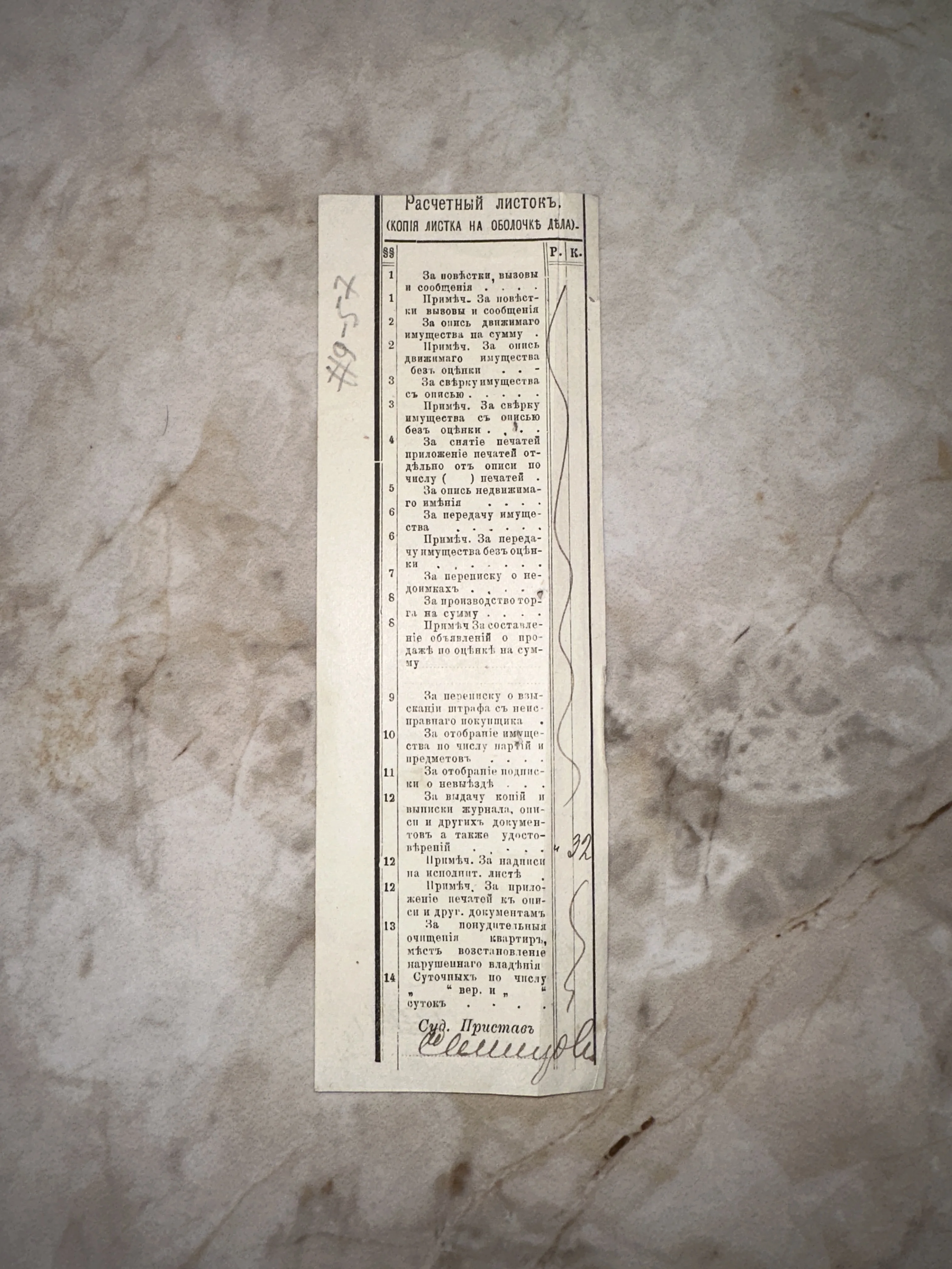 Вертикальный бумажный бланк дореволюционного расчетного листка судебного пристава с типографским текстом и рукописной подписью.