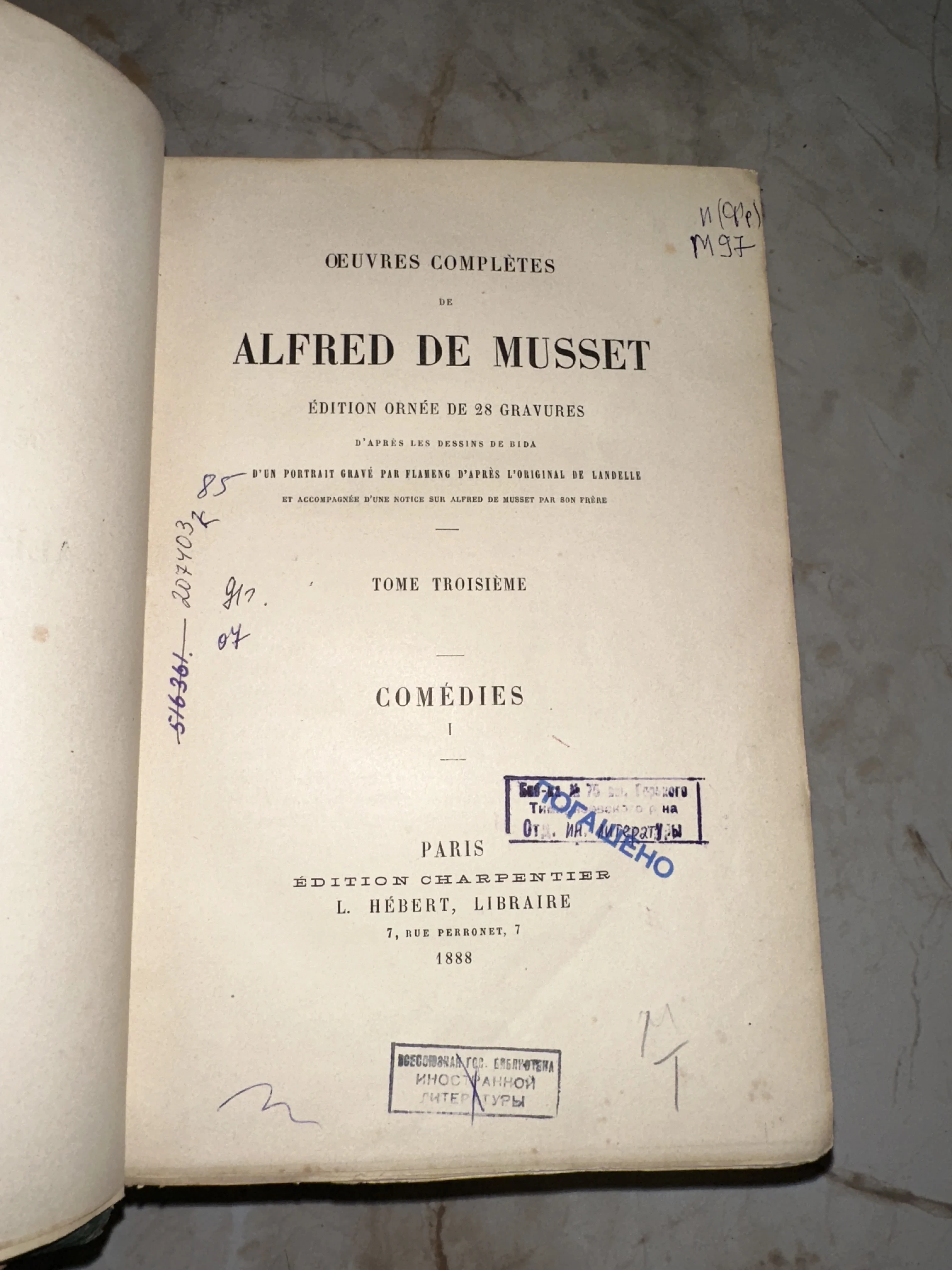 Изысканное парижское издание конца XIX века, вобравшее в себя бессмертные комедии Альфреда де Мюссе. Книга сохранила на своих страницах живую историю в виде библиотечных штампов и архивных пометок, что придает ей особую аутентичность и коллекционный интерес. Плотная бумага и строгая классическая верстка подчеркивают аристократизм этого антикварного тома.
