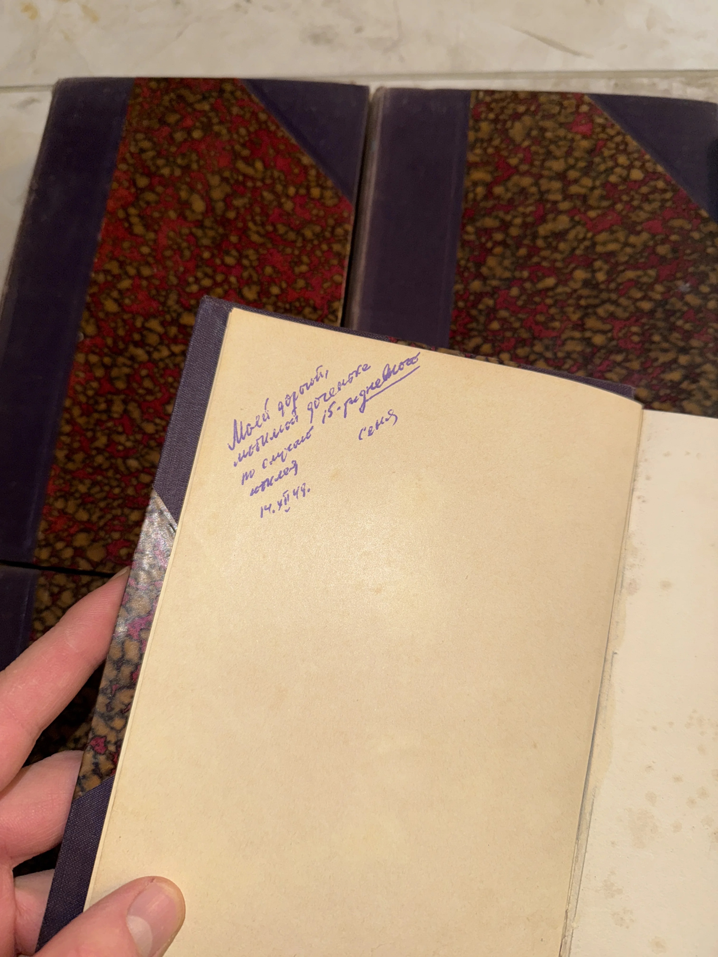 Уникальный экземпляр с трогательной историей: на форзаце сохранилось личное рукописное поздравление для дочери, датированное декабрем 1948 года. Книги в классических полукожаных переплетах с мраморной бумагой станут ценным приобретением для коллекционера, ценящего подлинную атмосферу и тепло домашних библиотек прошлого века.