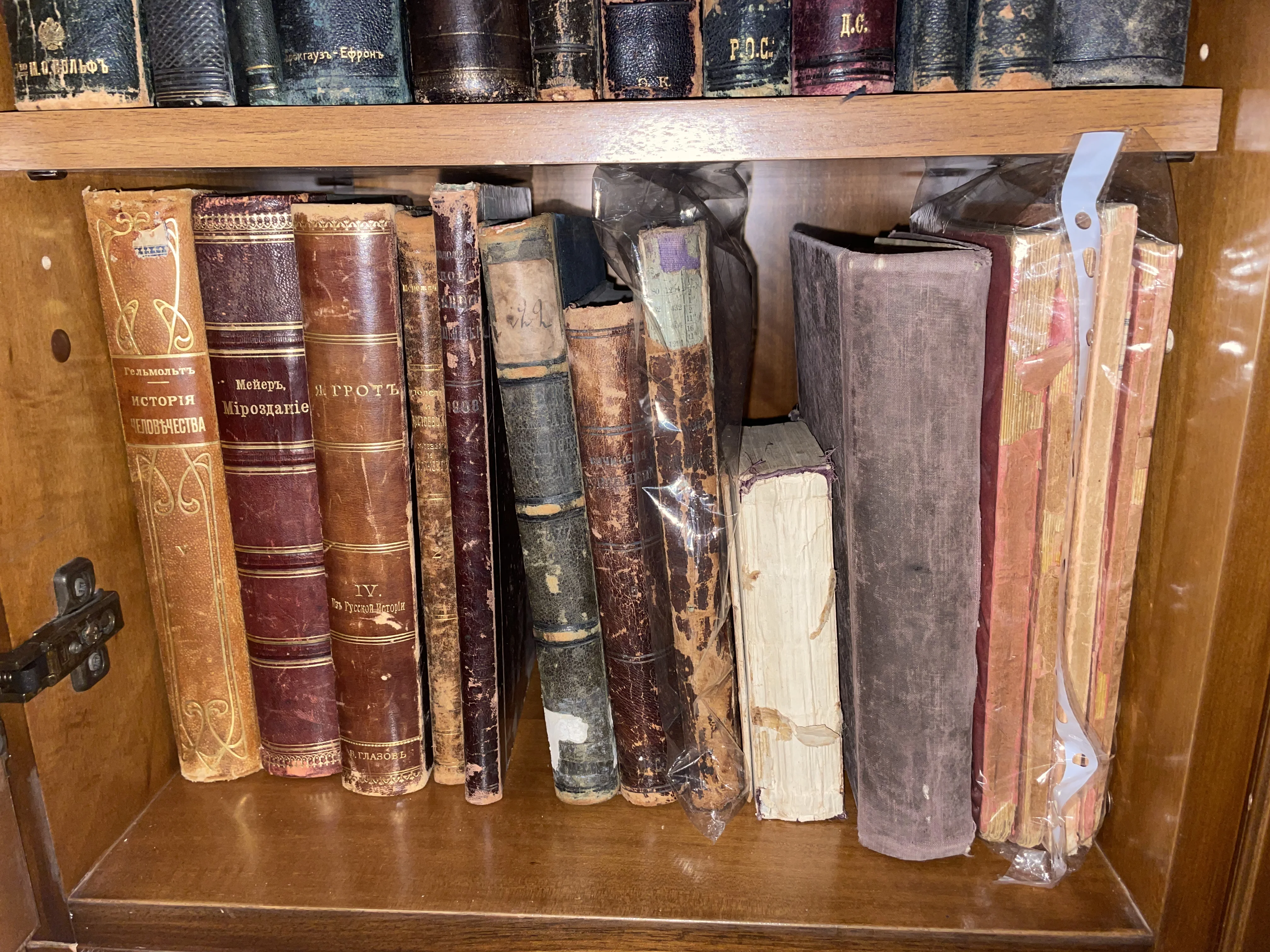 Старинные книги с золотым тиснением на корешках, включая тома Брокгауза и Ефрона, на деревянной полке.