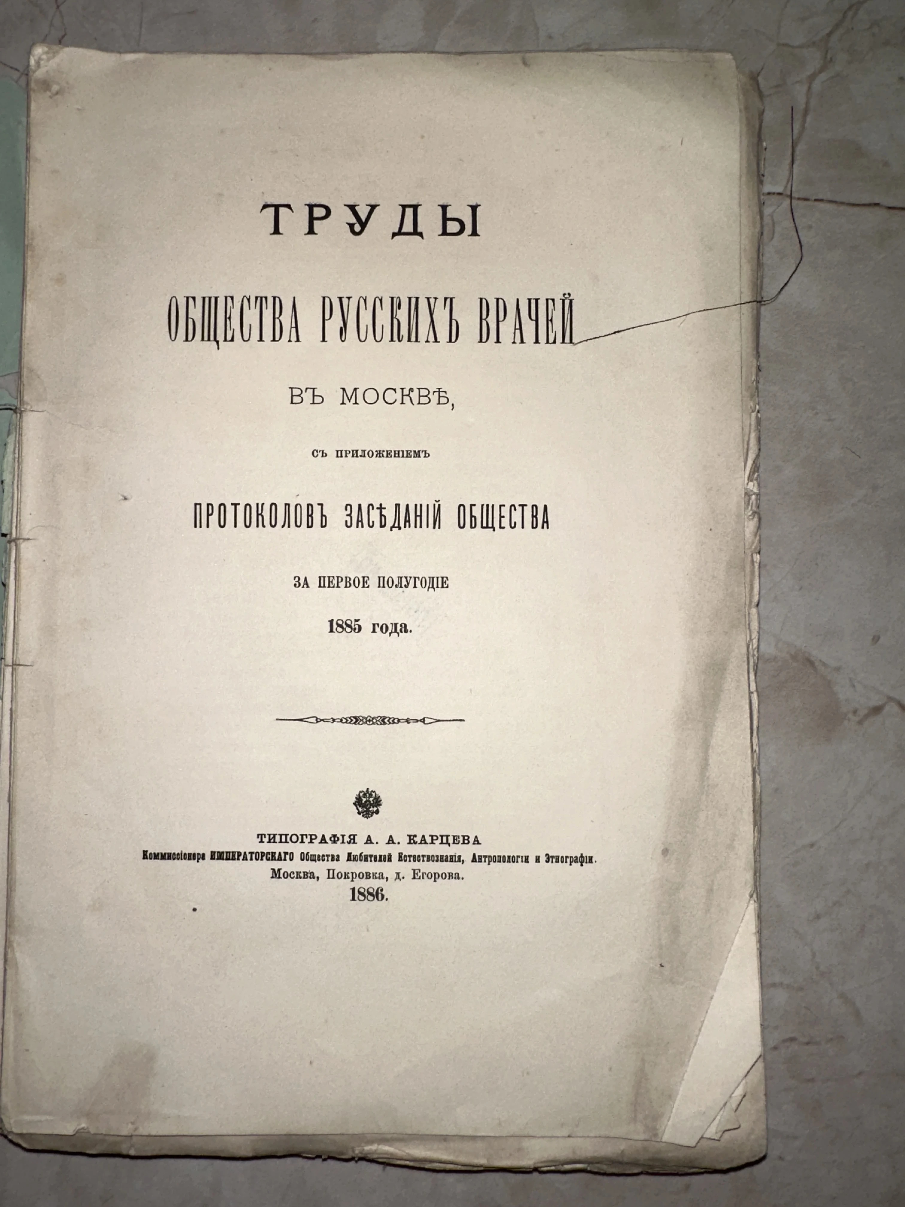 Титульный лист старинной книги 1886 года с названием Труды Общества русских врачей в Москве, изданной в типографии А. А. Карцева.