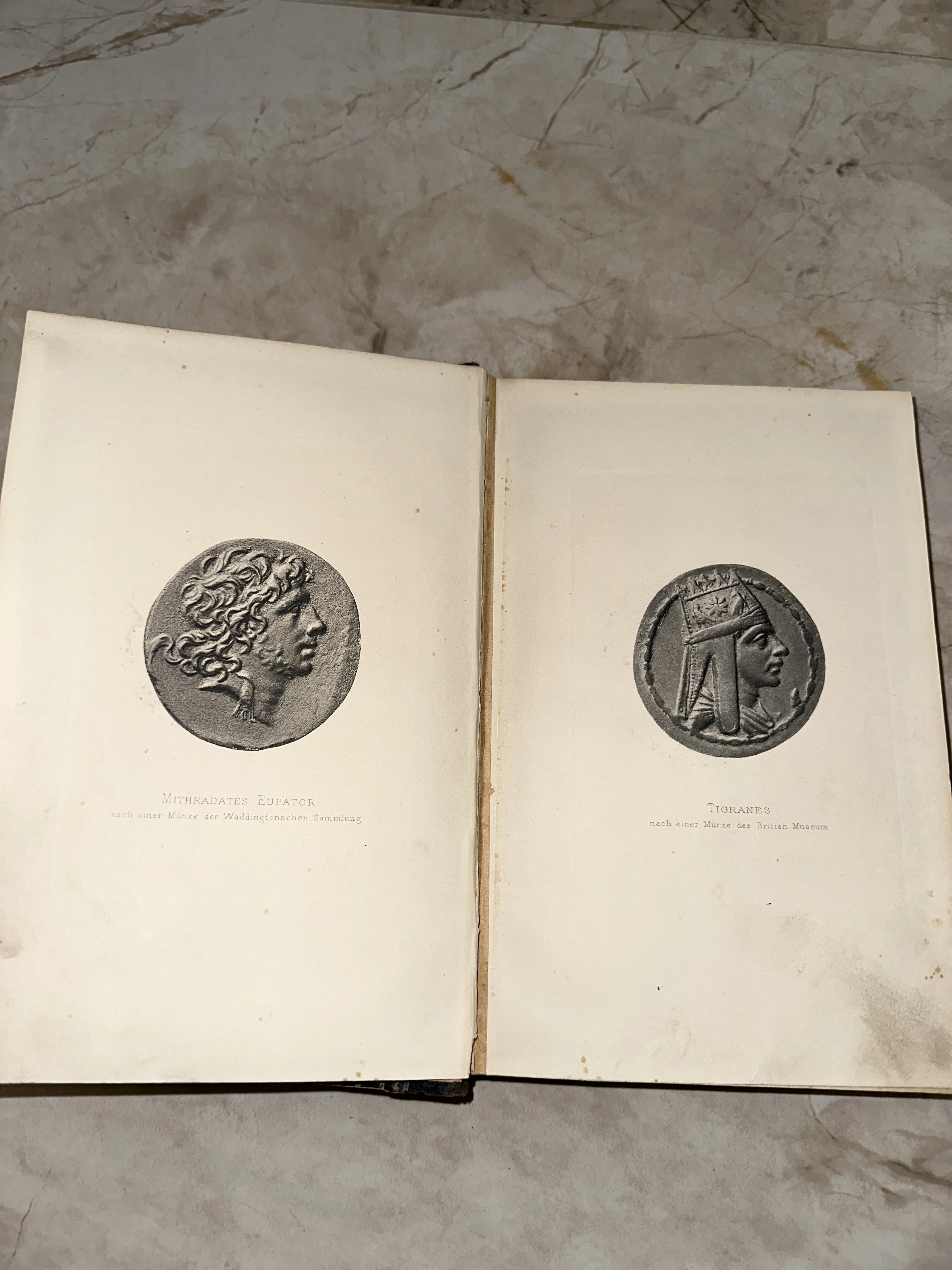 Великолепный образец академического издания, демонстрирующий детальные репродукции античных монет с портретами легендарных правителей Востока. Благородное пожелтение бумаги и легкая патина времени придают развороту особую историческую достоверность, превращая книгу в ценный объект для коллекционеров и любителей нумизматики. Четкие графические линии позволяют рассмотреть тончайшие детали чеканки, сохранившиеся сквозь века.