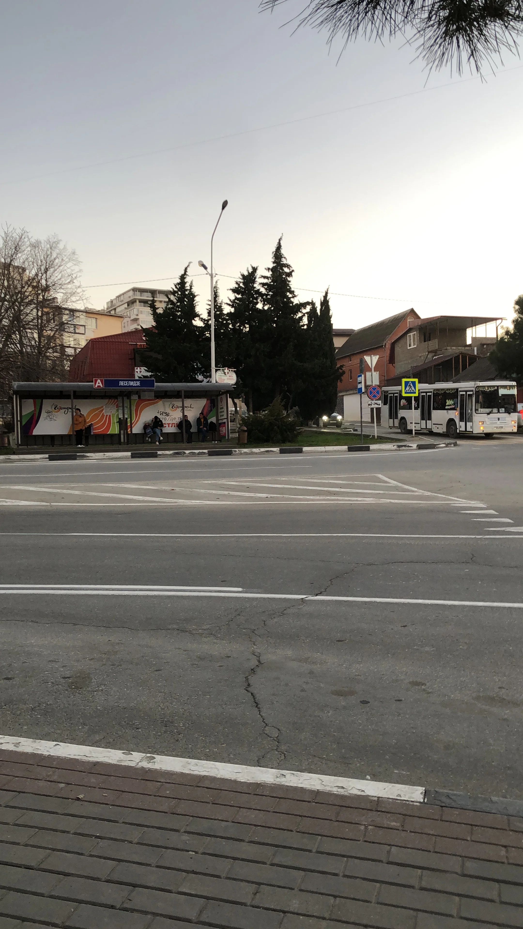 Городской пейзаж Сочи в сумерках с автобусной остановкой Леселидзе, белым автобусом и кипарисами на фоне горной застройки.