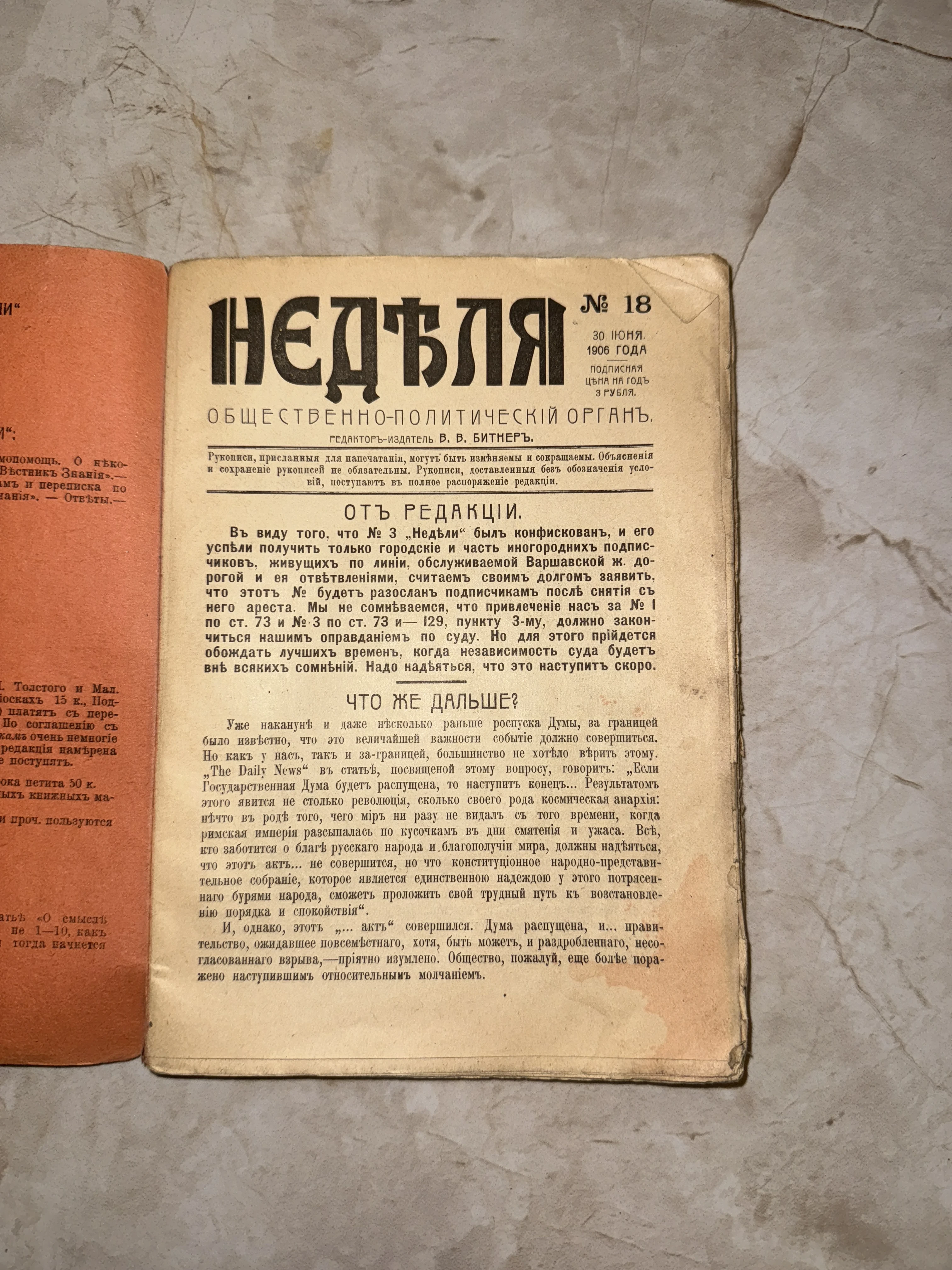 Подлинный артефакт эпохи Первой русской революции — общественно-политическое издание под редакцией В. В. Битнера. Текст на пожелтевших страницах повествует о драматичных событиях того времени, включая роспуск Государственной Думы и цензурные ограничения. Прекрасно сохранившаяся дореволюционная орфография и типографика делают этот экземпляр ценным историческим источником.