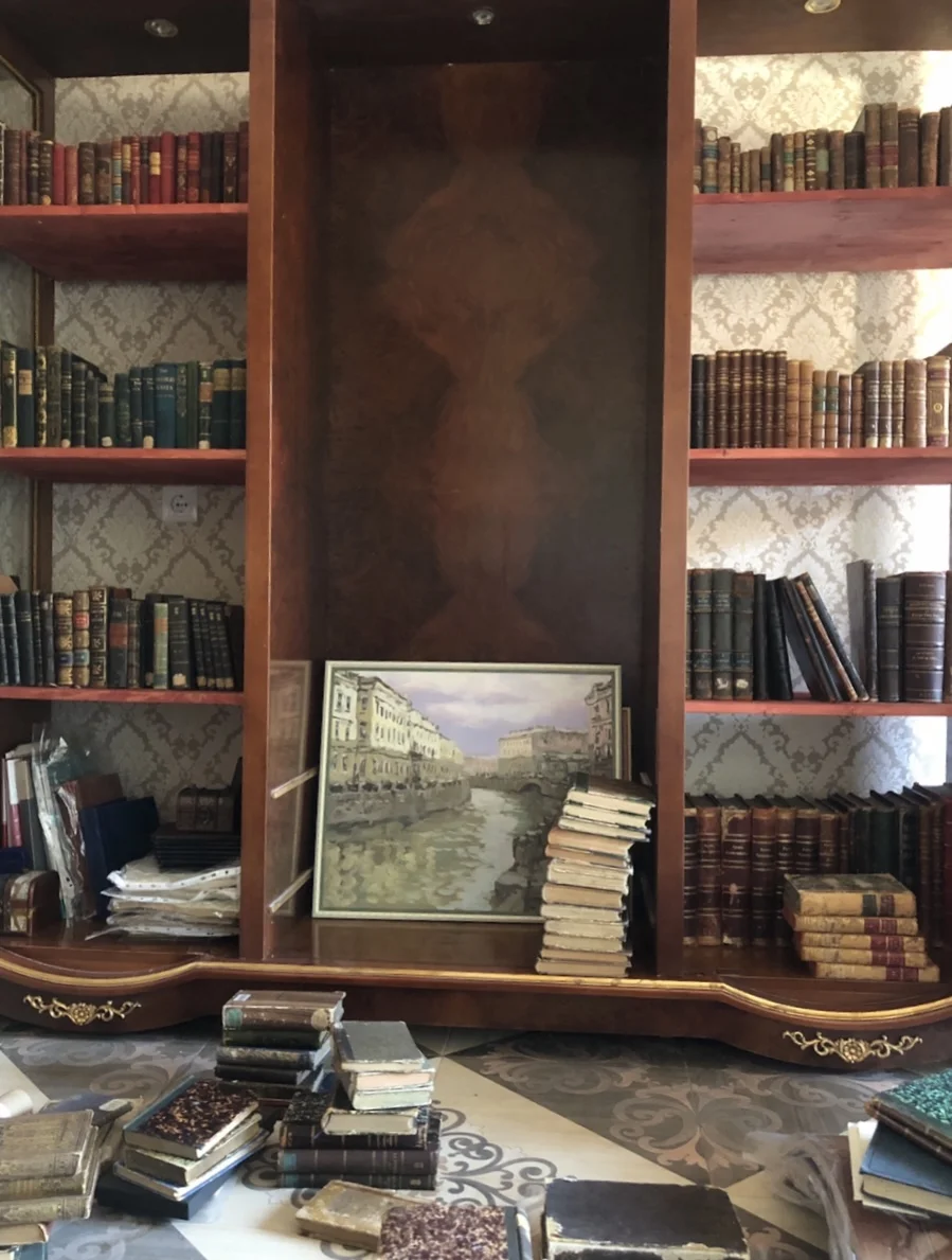 Изысканная коллекция старинных фолиантов в кожаных и тканевых переплетах, аккуратно расставленных на полках массивного шкафа. Центр экспозиции украшает живописный пейзаж с городским каналом, создавая атмосферу благородного уединения и интеллектуального богатства.