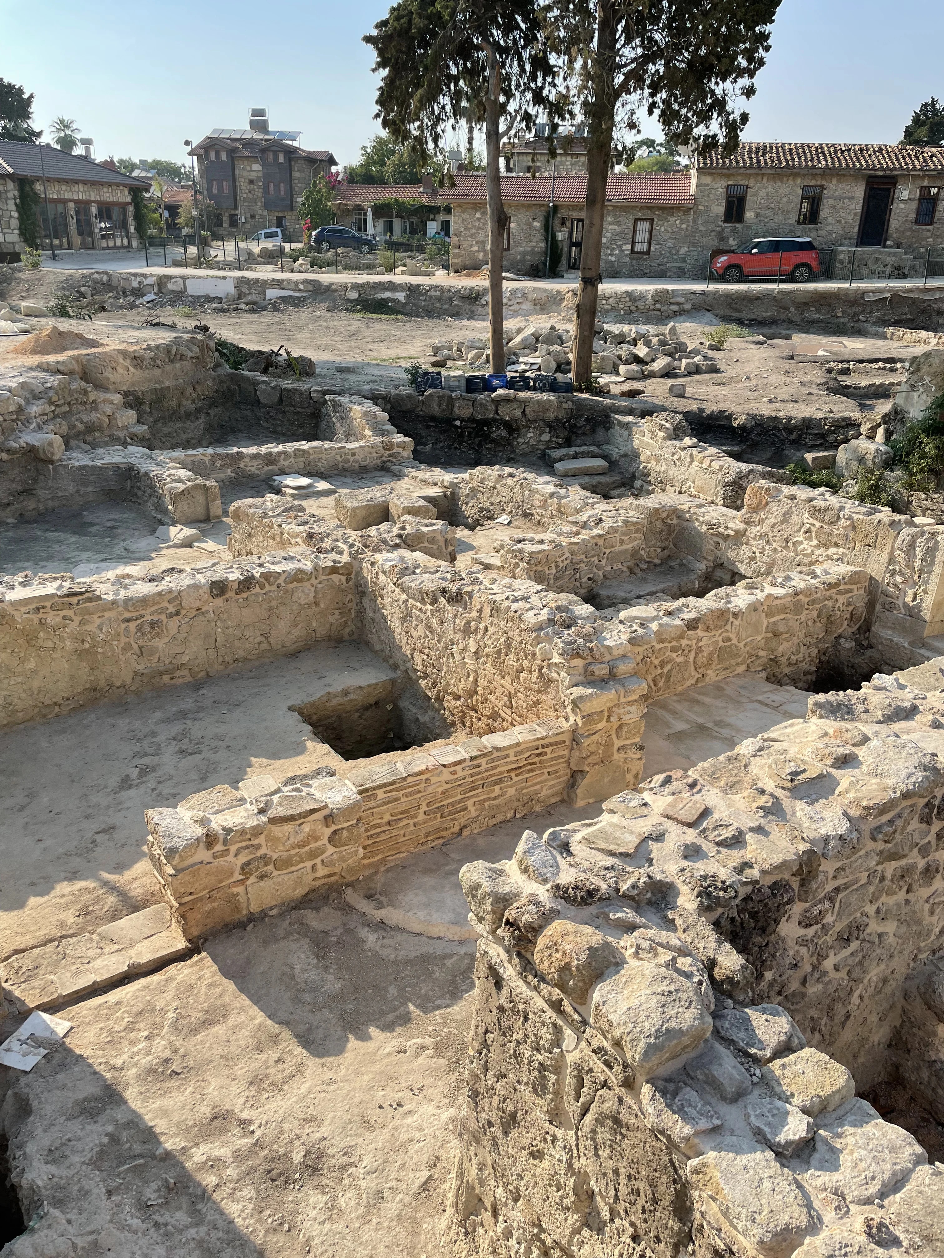 Вид сверху на каменные фундаменты и руины древних стен в месте археологических раскопок на фоне современных зданий.