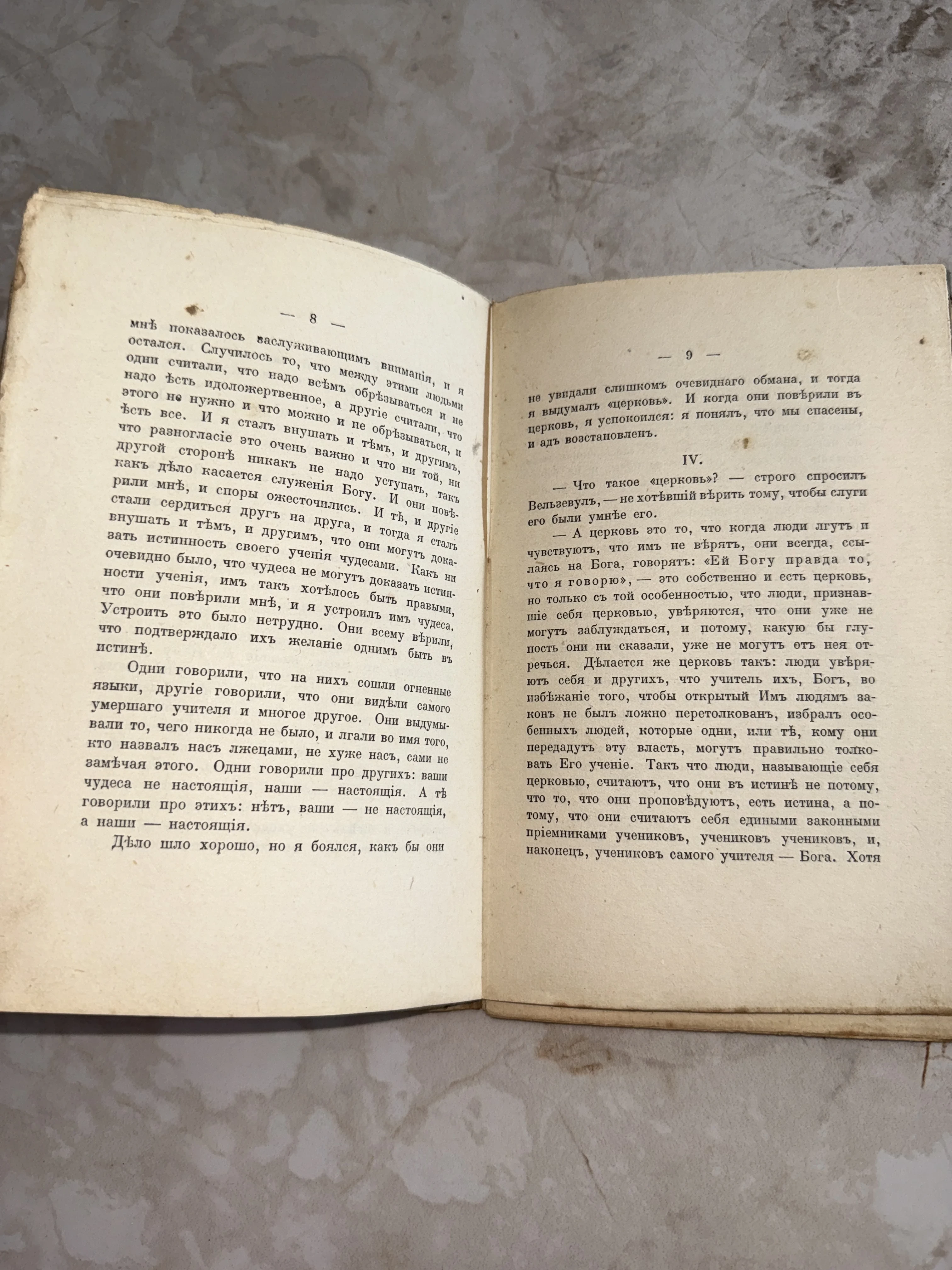 Перед вами подлинный фрагмент истории — разворот редкого издания, отпечатанного с использованием дореволюционной орфографии. Пожелтевшая от времени бумага и характерный типографский шрифт передают дух эпохи духовных исканий конца XIX века. Книга сохранила благородную патину старины, приглашая читателя прикоснуться к философским размышлениям о вере и истине.