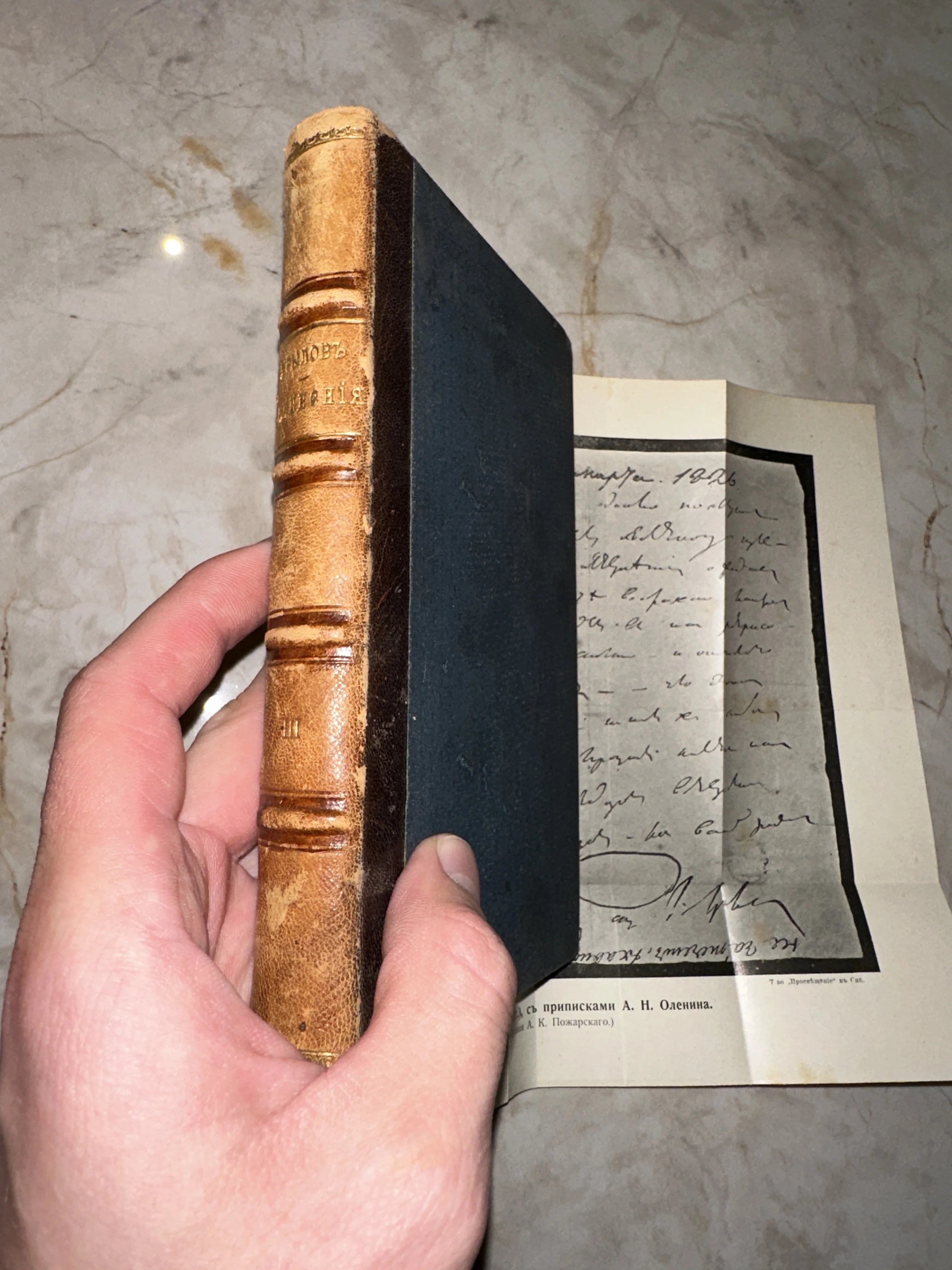 Старинная книга в кожаном переплете с золотым тиснением и факсимиле рукописи А. Н. Оленина.