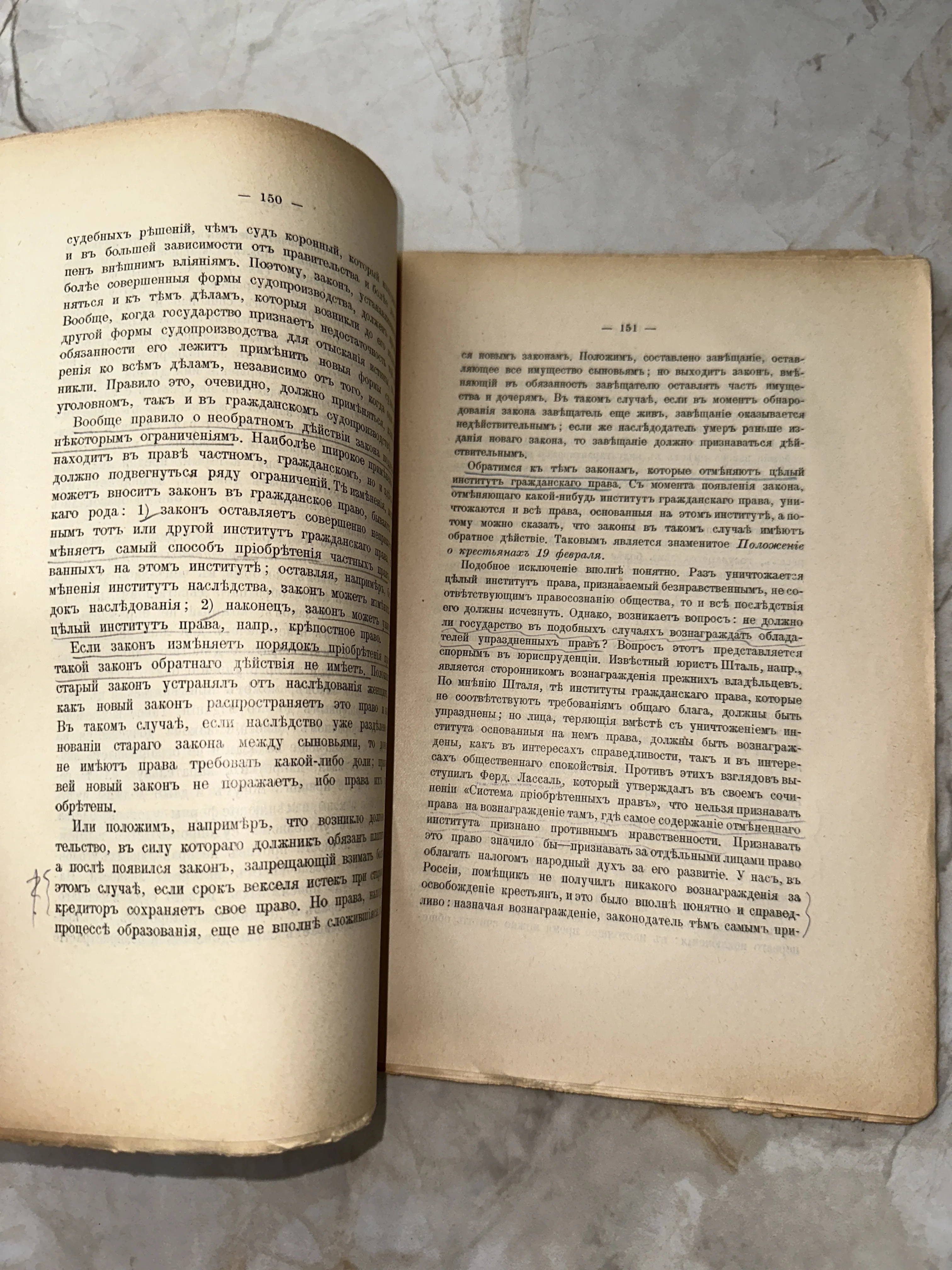 Перед вами страницы редкого юридического трактата, напечатанного в дореволюционной России. Плотная бумага с характерной патиной времени и строгий шрифт передают дух эпохи великих реформ и серьезных правовых дискуссий. Состояние страниц свидетельствует о почтенном возрасте и исторической ценности этого экземпляра.