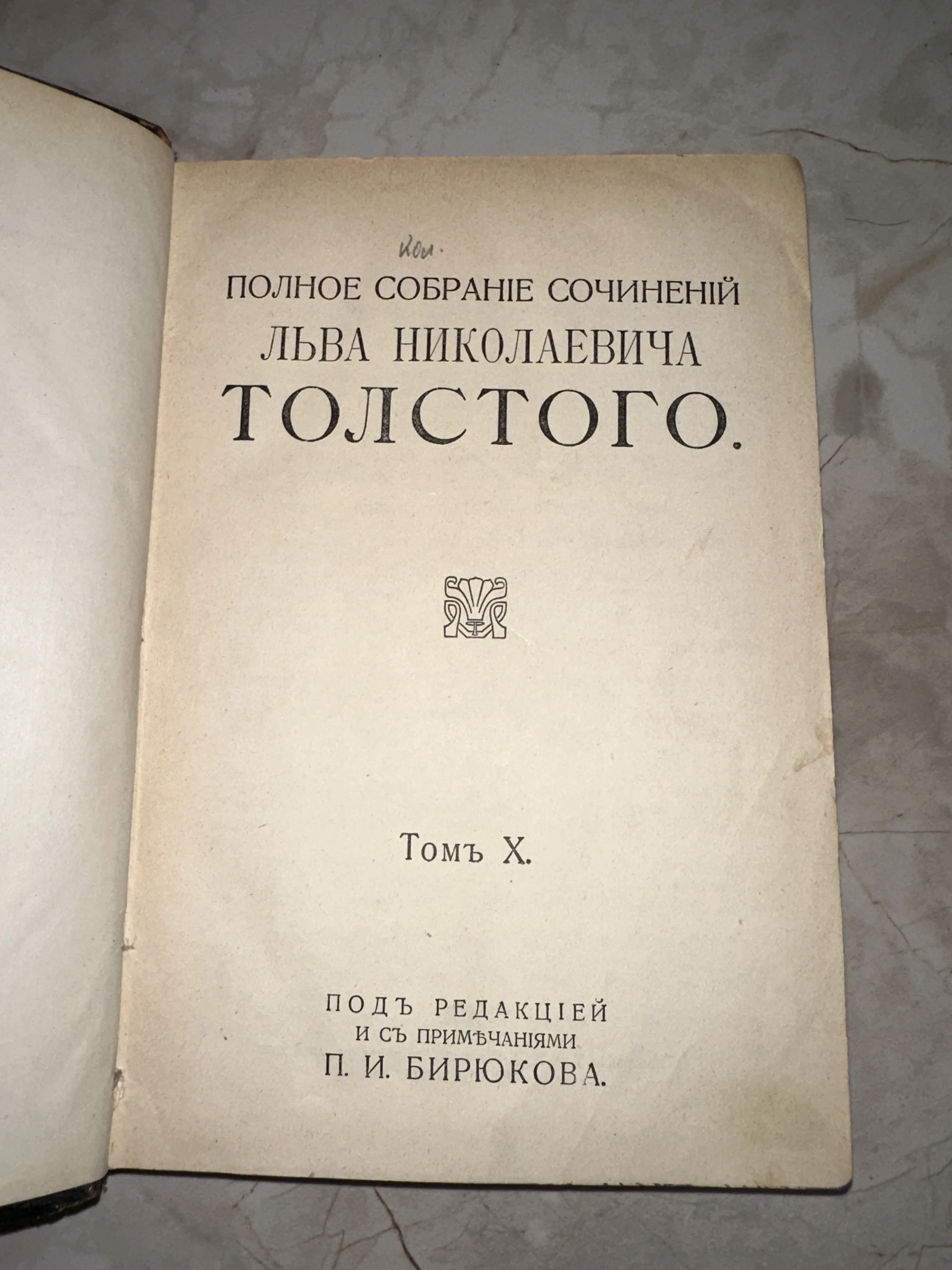 Титульный лист антикварной книги: Полное собрание сочинений Льва Николаевича Толстого, Том X, под редакцией П. И. Бирюкова.