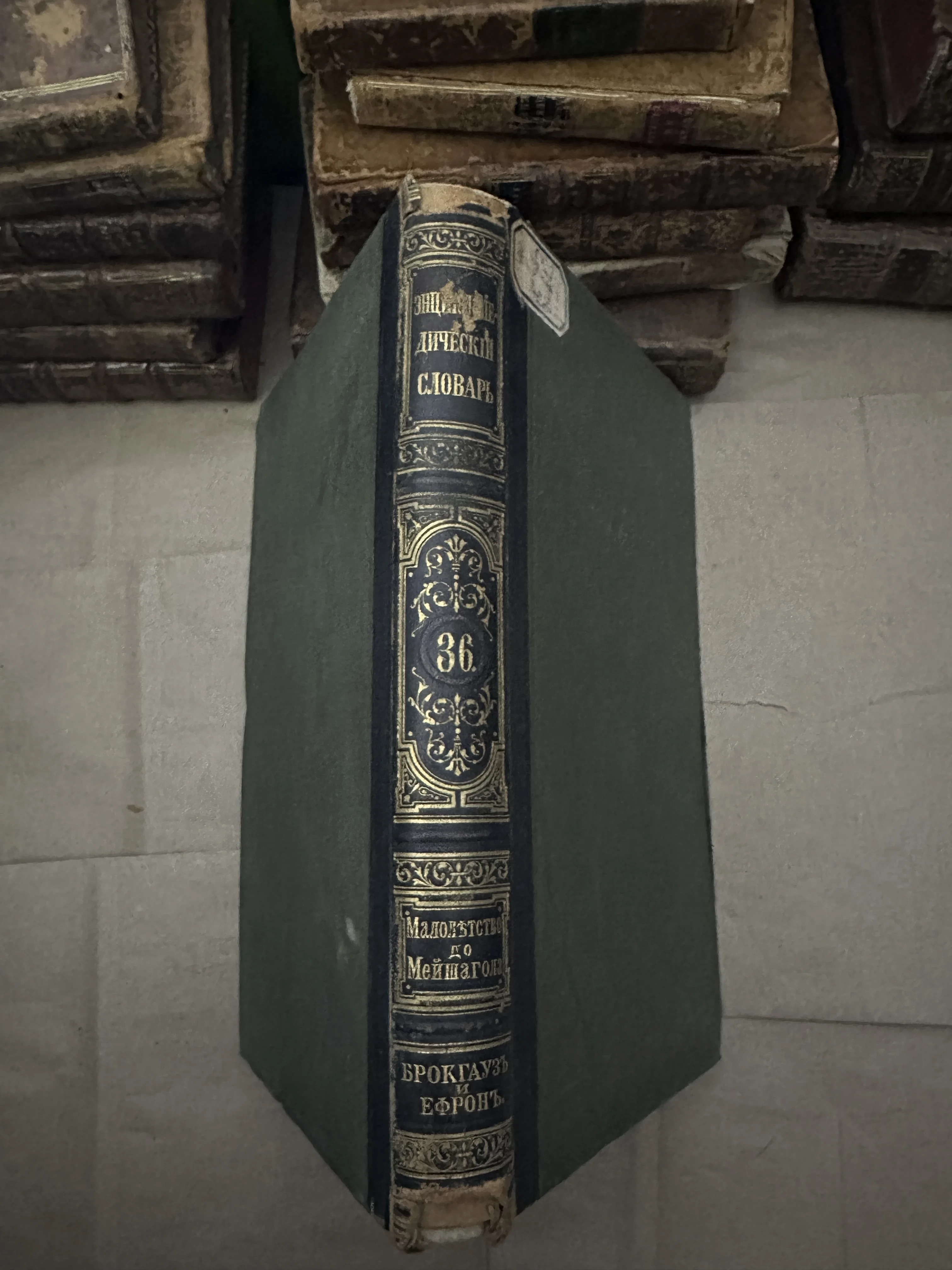 Перед вами легендарный 36-й том крупнейшей дореволюционной энциклопедии, охватывающий знания от «Малолетства» до «Мейшаголы». Книга сохранила оригинальный полукожаный переплет с изысканным золотым тиснением, которое благородно сияет на фоне патины времени и стопок других антикварных фолиантов.