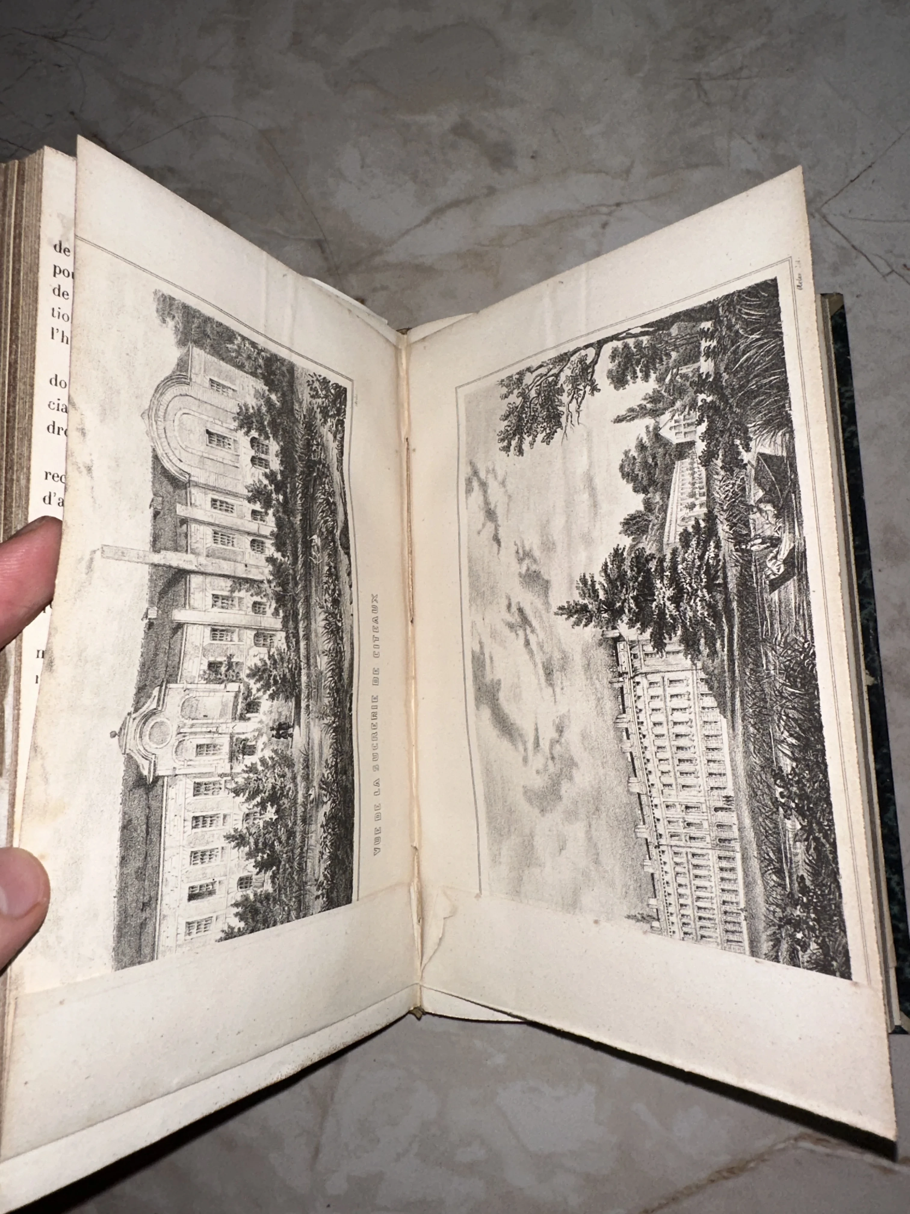 Разворот старинной книги с двумя черно-белыми литографиями, изображающими архитектуру сахарного завода в Сито (Vue de la Sucrerie de Citeaux).