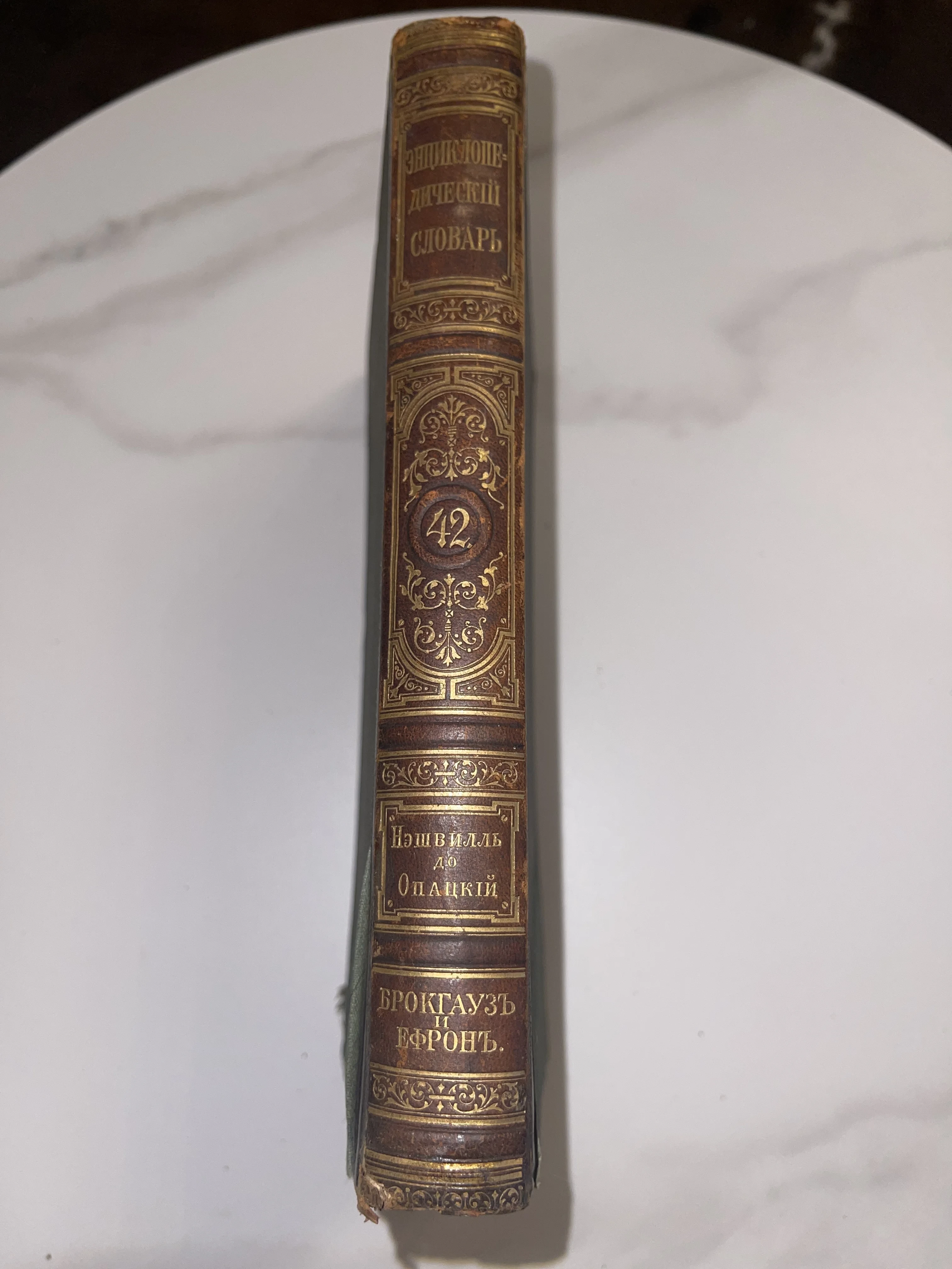 Монументальный образец книгоиздательского искусства конца XIX — начала XX века в классическом кожаном переплете с богатым золотым тиснением. Благородная патина времени на корешке и изящные орнаменты подчеркивают коллекционную ценность этого тома, ставшего символом дореволюционной эрудиции.