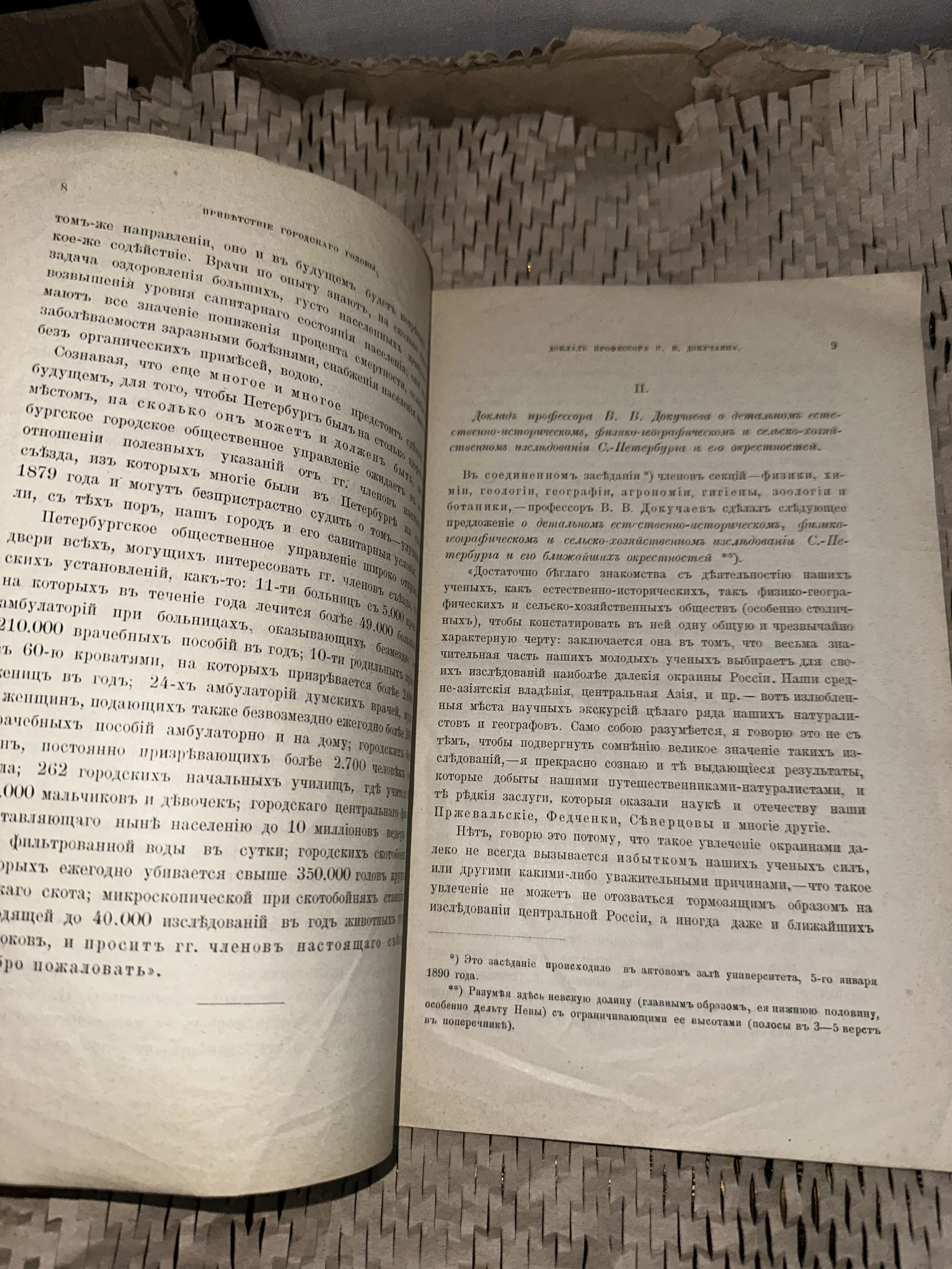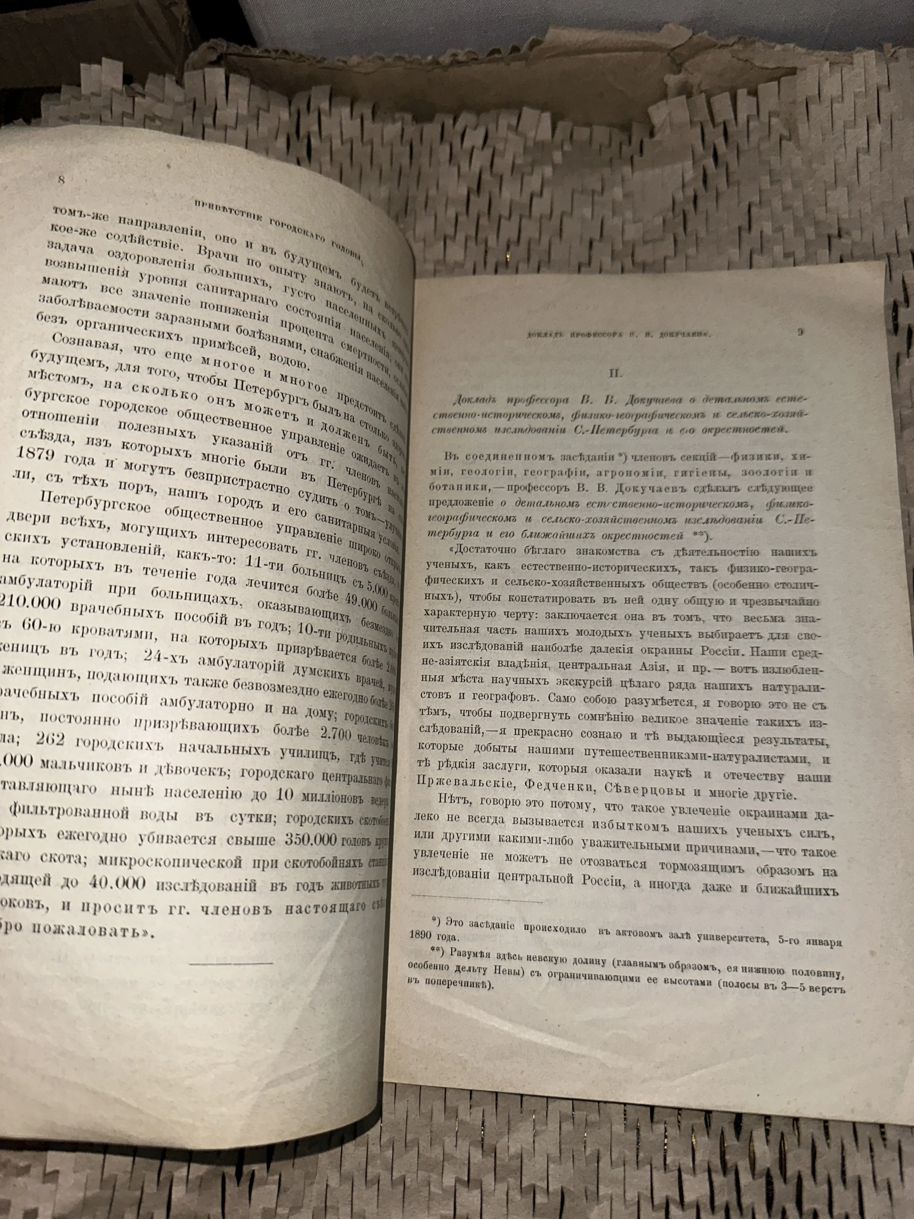Перед вами подлинный фрагмент научной истории: доклад основоположника почвоведения В. В. Докучаева, посвященный комплексному изучению окрестностей Санкт-Петербурга. Пожелтевшая бумага и дореволюционная орфография подчеркивают почтенный возраст издания, которое станет ценным приобретением для коллекционера редких книг и любителей истории науки.