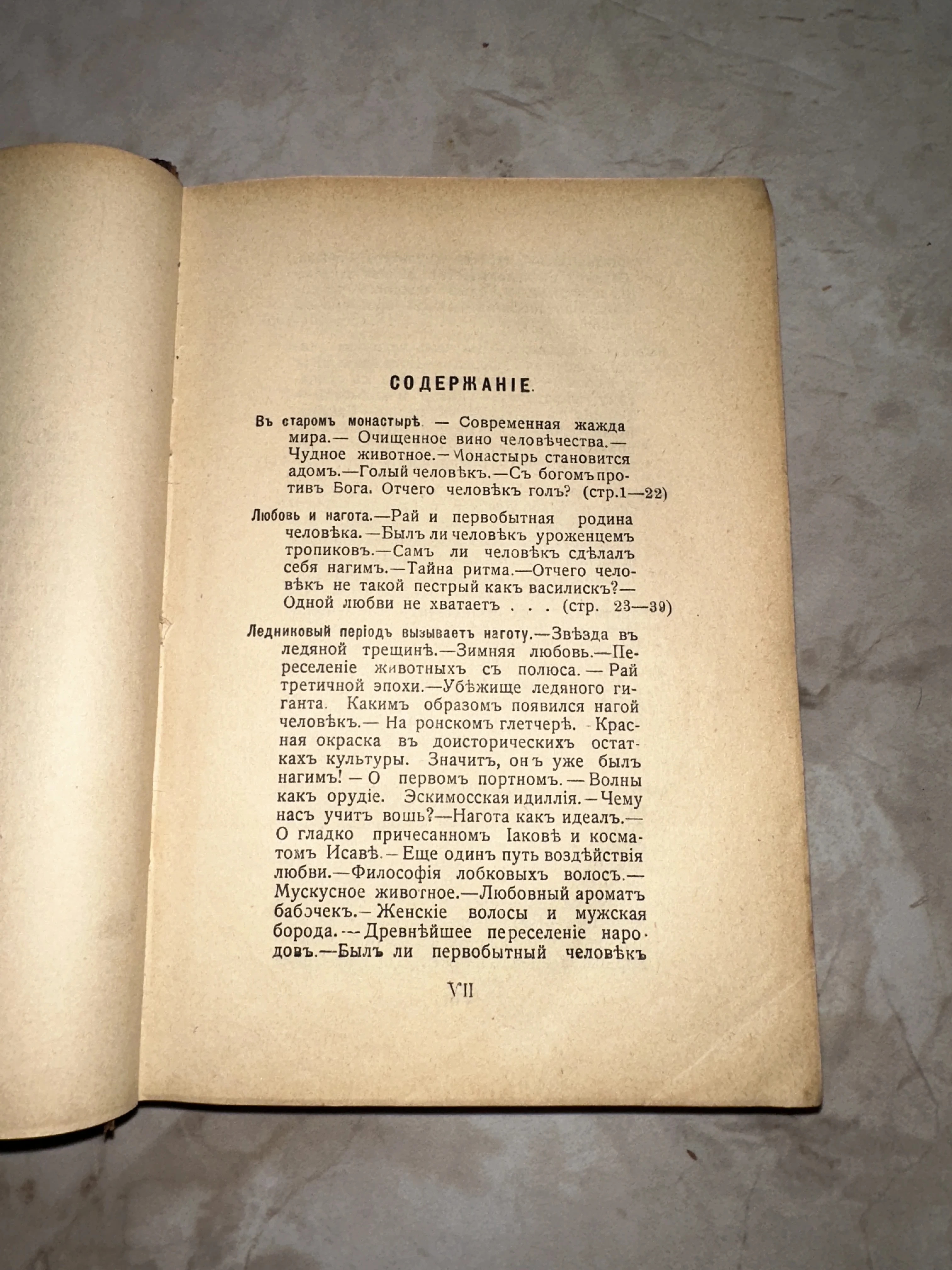 Редкий образец дореволюционной печати с сохранившимся оглавлением, раскрывающим глубокие философские и антропологические темы. Благородная патина пожелтевшей бумаги и характерный шрифт конца XIX — начала XX века передают подлинную атмосферу старинной библиотеки. Текст сохранил идеальную четкость, приглашая читателя погрузиться в интеллектуальный поиск ушедшей эпохи.