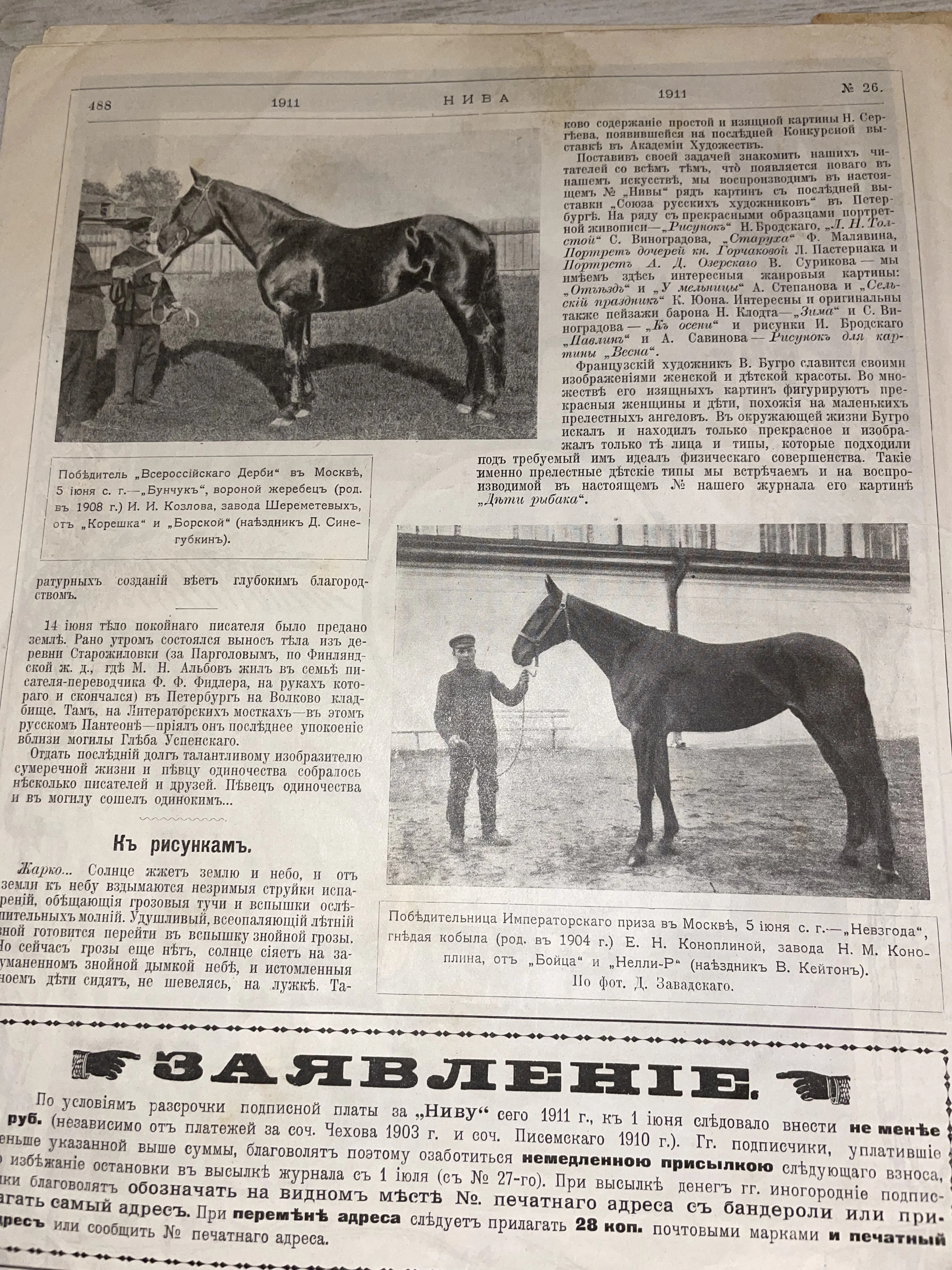 Подлинный артефакт эпохи Николая II: страница из популярнейшего еженедельника «Нива» с редкими снимками призовых рысаков Бунчука и Невзгоды. Текст сохранил уникальную дореволюционную орфографию, погружая в культурную и светскую жизнь России 1911 года. Идеальный экземпляр для коллекционеров периодики, любителей иппологии или оформления интерьера в ретро-стиле.