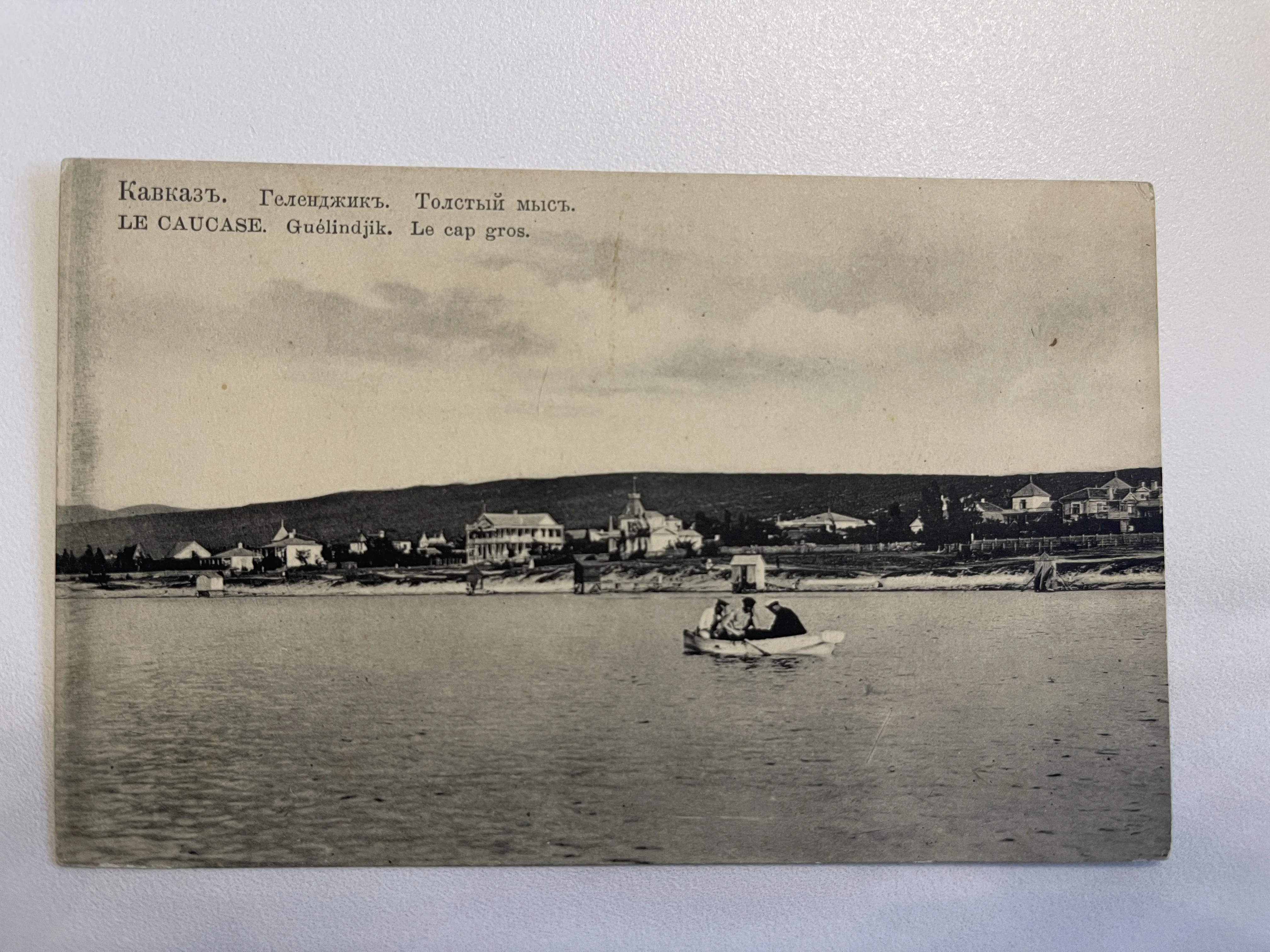 Черно-белая почтовая открытка начала XX века с панорамой Толстого мыса в Геленджике и лодкой на воде.
