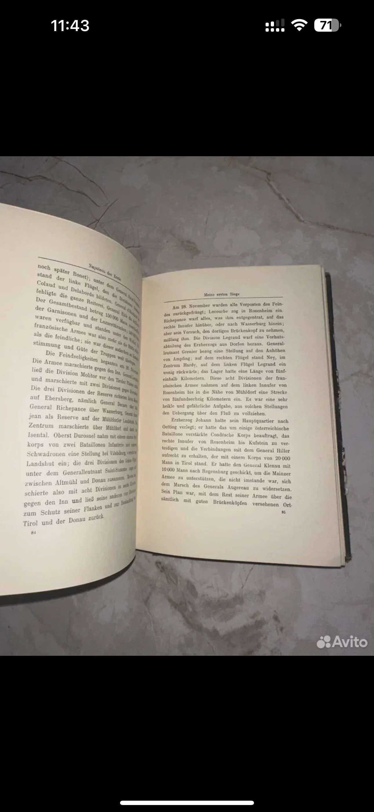 Перед вами редкий образец исторической литературы, повествующий о военных кампаниях и триумфах Наполеона Бонапарта. Текст на немецком языке отпечатан на качественной бумаге с легким оттенком времени, сохранив четкость шрифта и строгость классического оформления. Это издание станет жемчужиной в библиотеке ценителя европейской истории и военно-политических мемуаров.