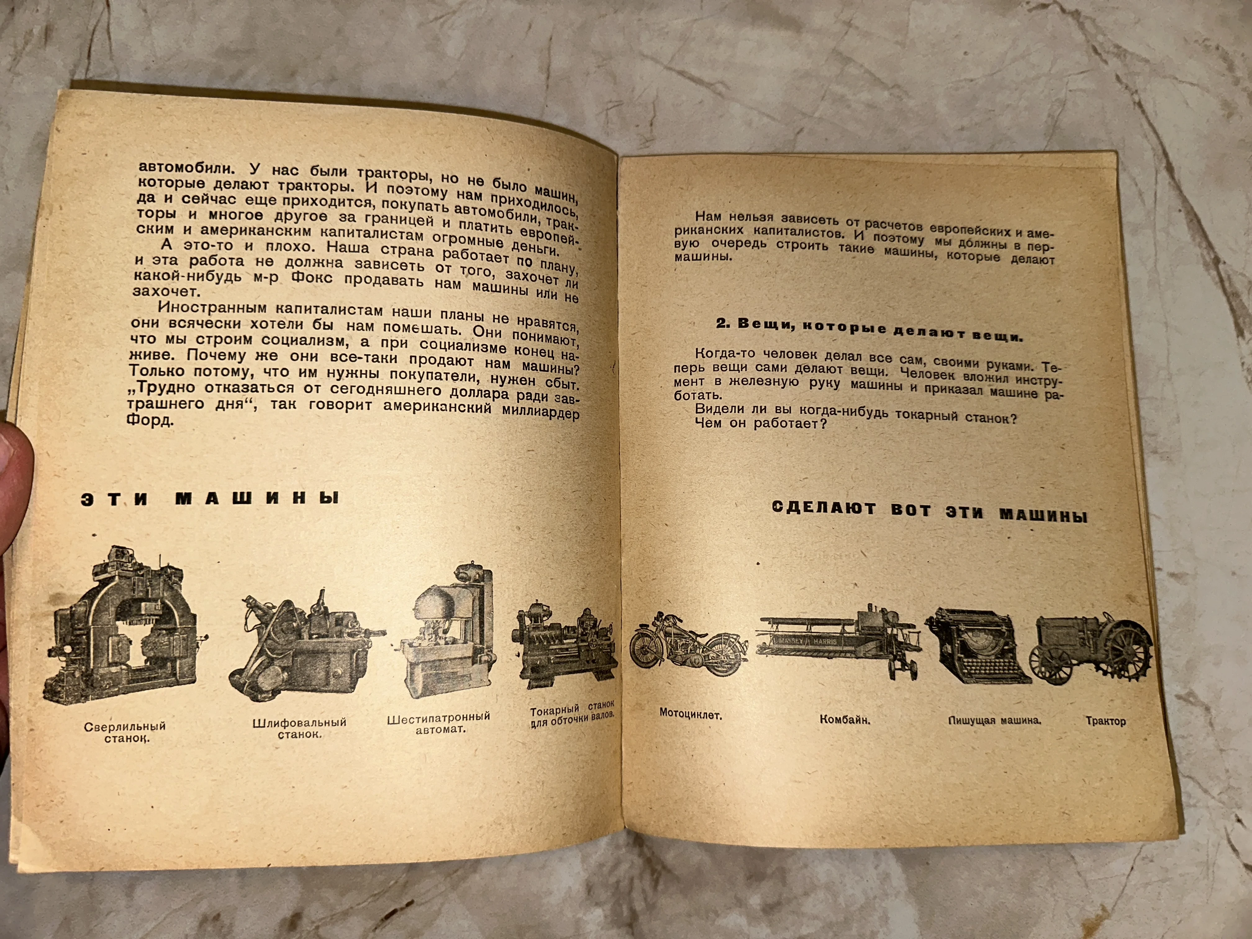 Уникальный образец советской агитационной и просветительской литературы, посвященный эпохе великой индустриализации. На страницах представлены детальные гравированные изображения техники — от токарных станков до первых комбайнов и тракторов, отражающие дух технического прогресса СССР. Естественная патина времени и сохранность текста делают этот экземпляр ценным приобретением для коллекционеров промышленной истории.